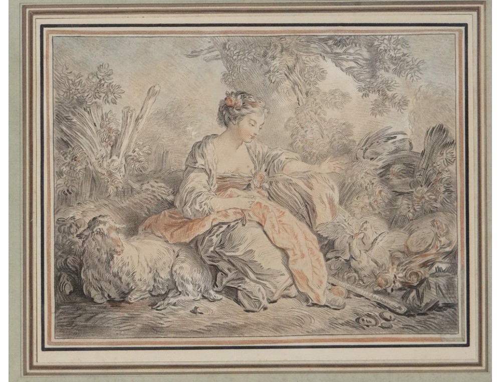 Very nice engraving of a young shepherdess resting in a rural landscape at the edge of a wood, surrounded by sheep and birds, XIXth century.
