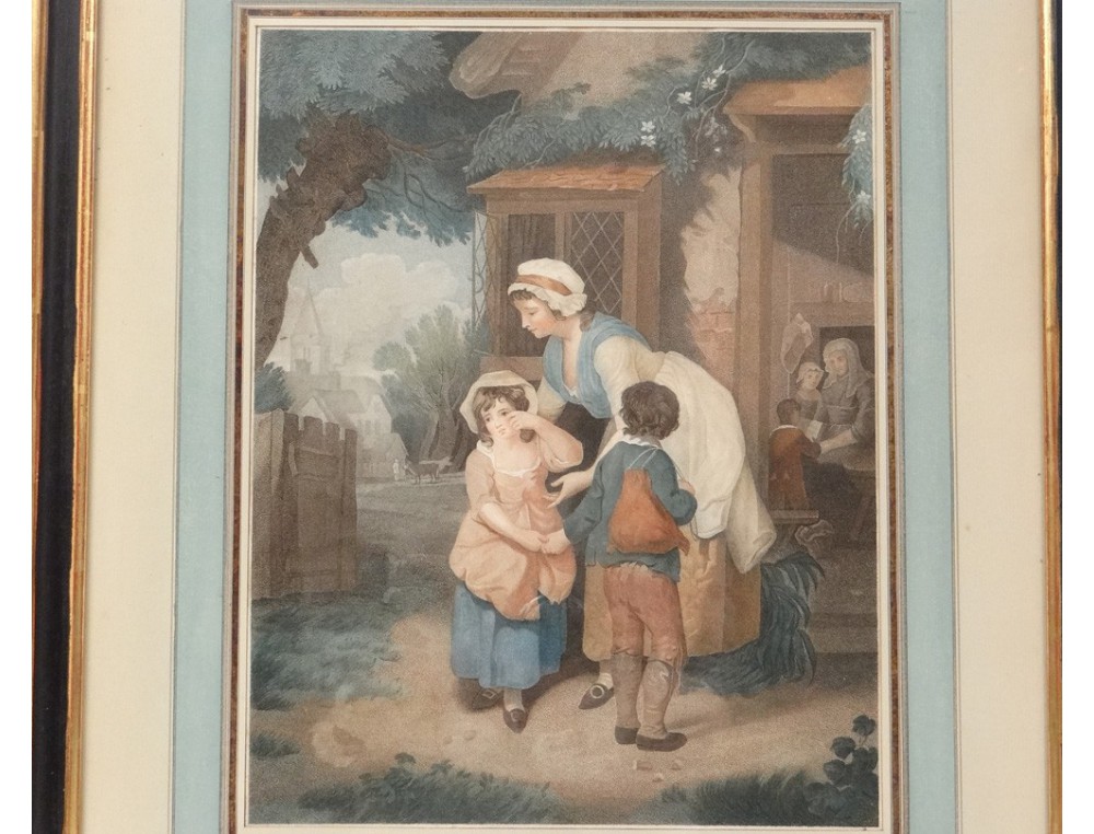 Very nice engraving of a woman consoling two young children in the yard of a farm in a small village, with the steeple of the church visible in the background of XIXth century.