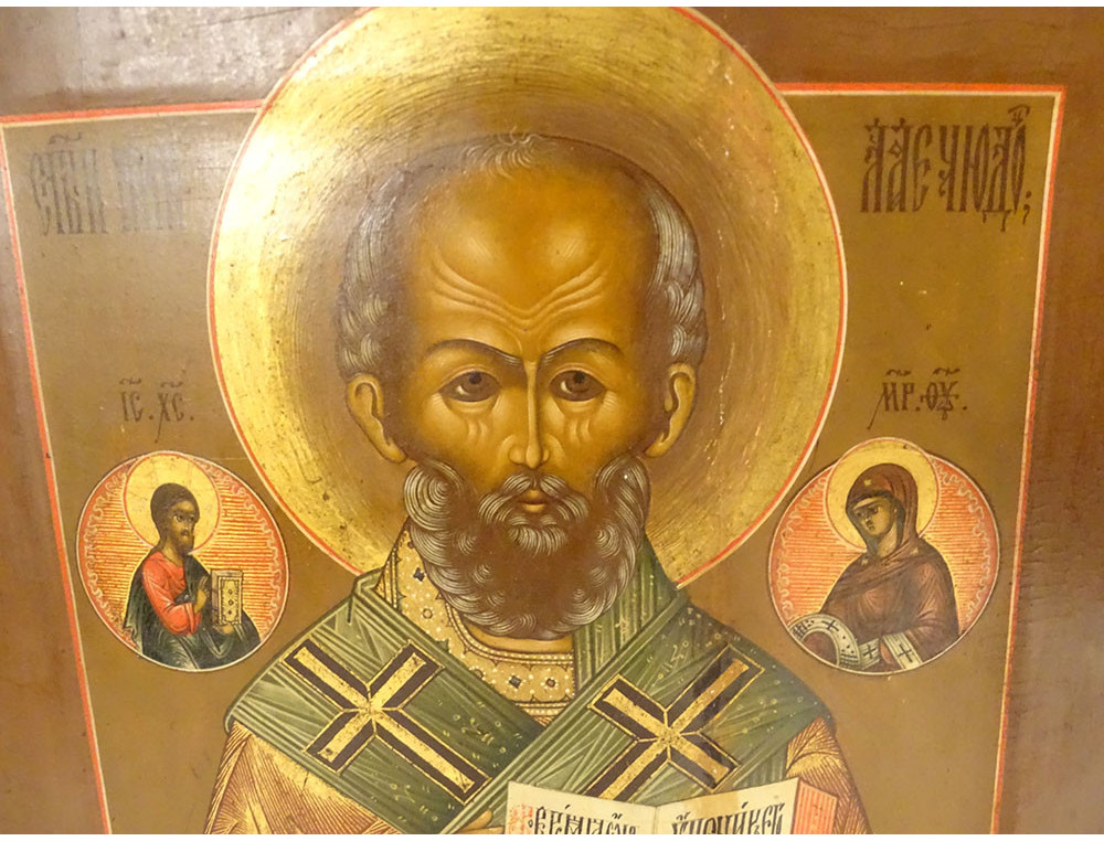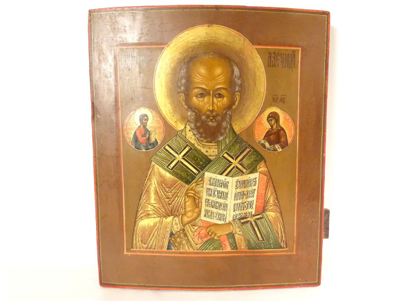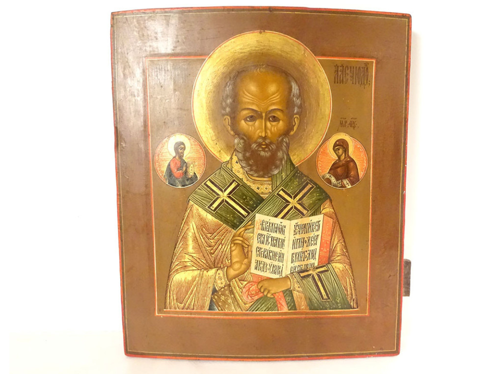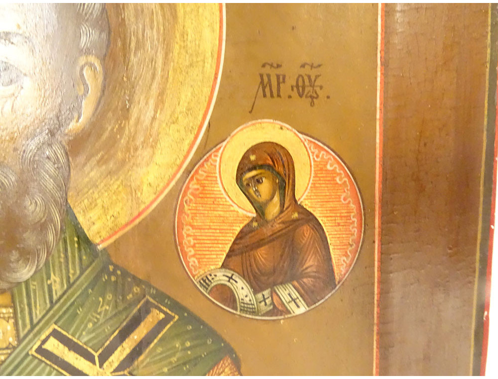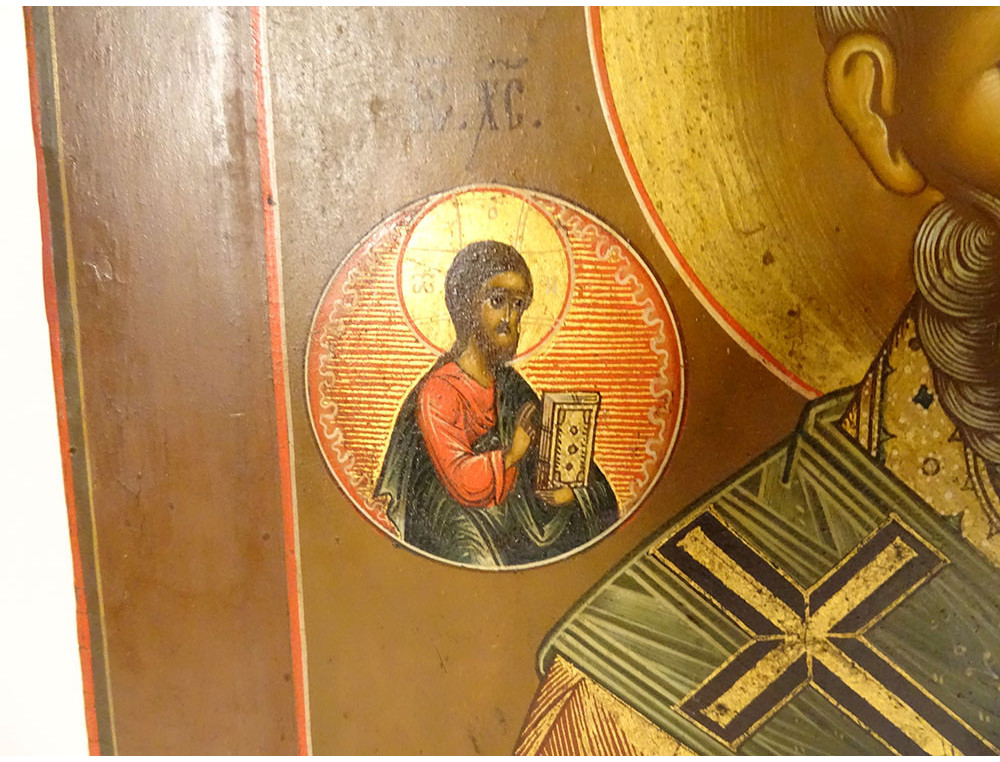 Russian Orthodox icon (oil on panel) depicting Saint Nicholas*, Bishop of Myra, known as the Thaumaturge (= miracle worker) in episcopal robes and holding a Bible in Cyrillic characters, Christ and the Virgin appearing in small side medallions, from the 19th century.