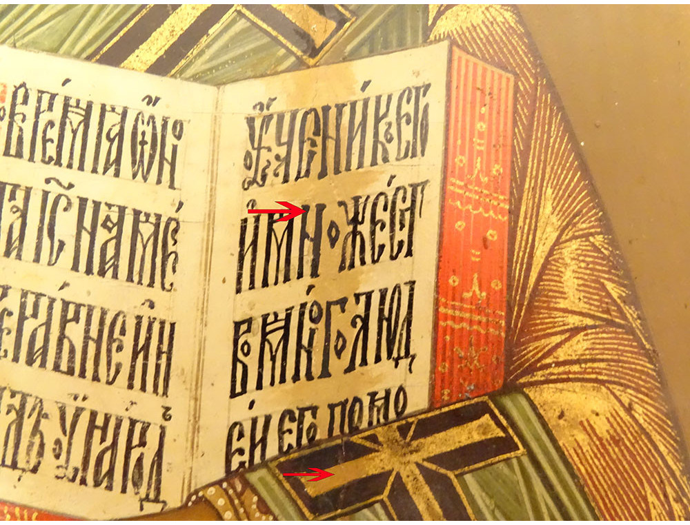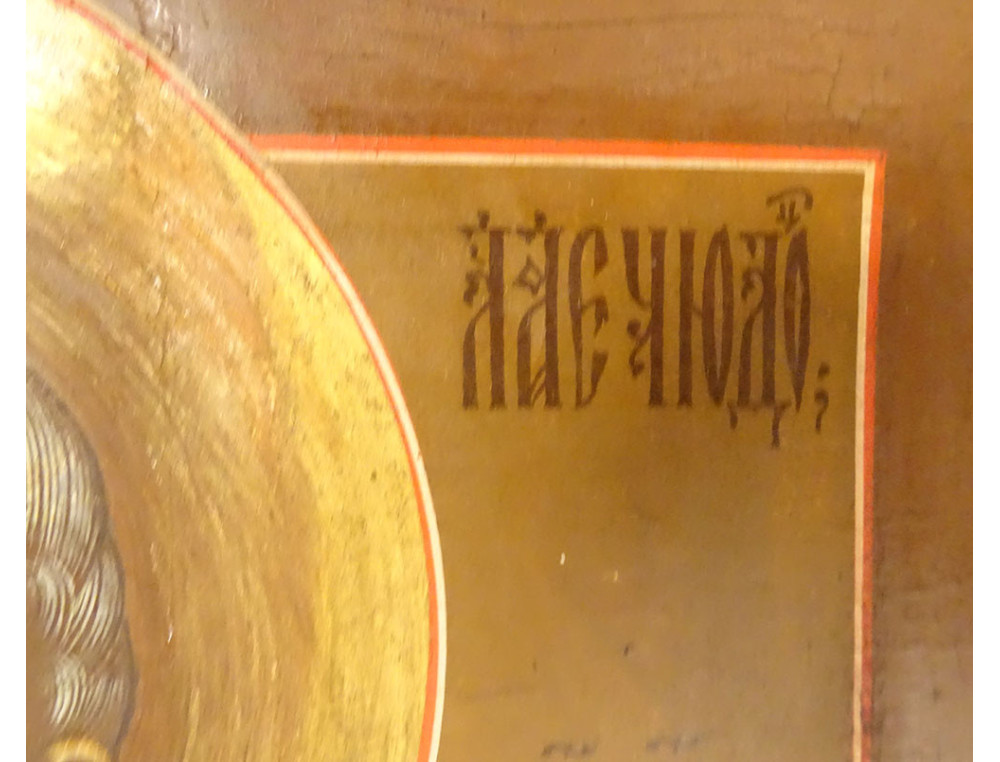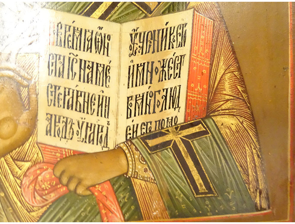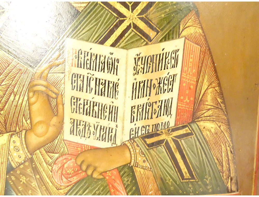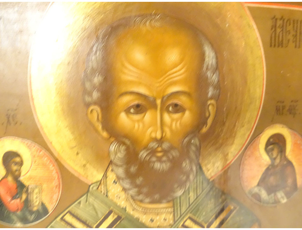 Russian Orthodox icon (oil on panel) depicting Saint Nicholas*, Bishop of Myra, known as the Thaumaturge (= miracle worker) in episcopal robes and holding a Bible in Cyrillic characters, Christ and the Virgin appearing in small side medallions, from the 19th century.