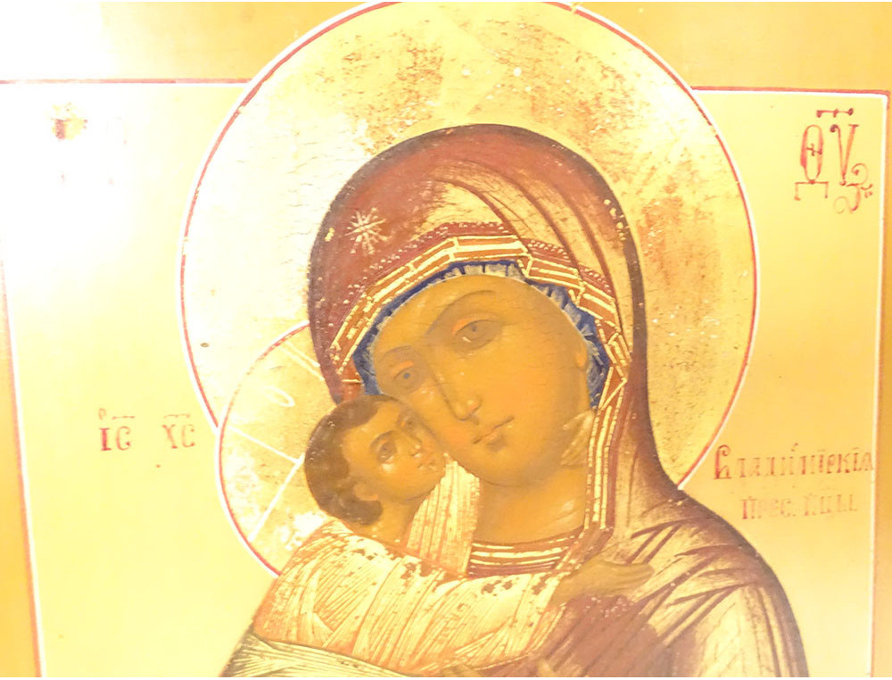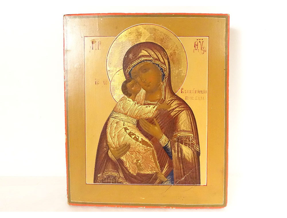Russian Orthodox icon (oil on panel) depicting the Virgin Mary holding the Infant Jesus, representation of Our Lady of Vladimir* or Virgin of Tenderness, from the 19th century.