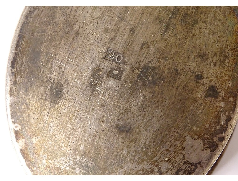 Oval silver plated reliquary dedicated to several Saints: "Sancti Andrea Apostoli, Sancti Sucae Apostoli, Sancti Vincenti Diaconi, Sancti Antonii AbbatiA, Sancti Benedicti Abbbatia", XIXth century.