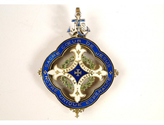 -Reliquary door, enamel pendant finely decorated with a cross and a crown of thorns, marked "Sacred Heart of Jesus Our Hope Unique Save the Church and France," the initials IHS adorned with an anchor, of XIXth century.