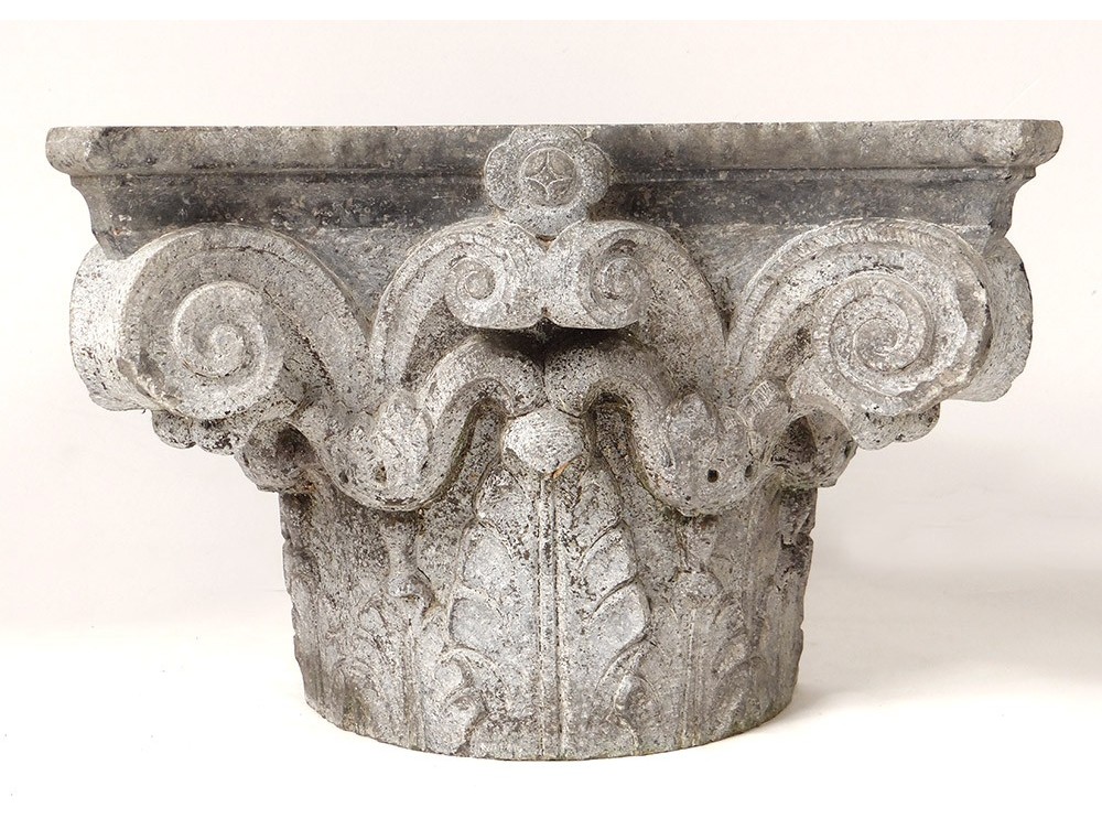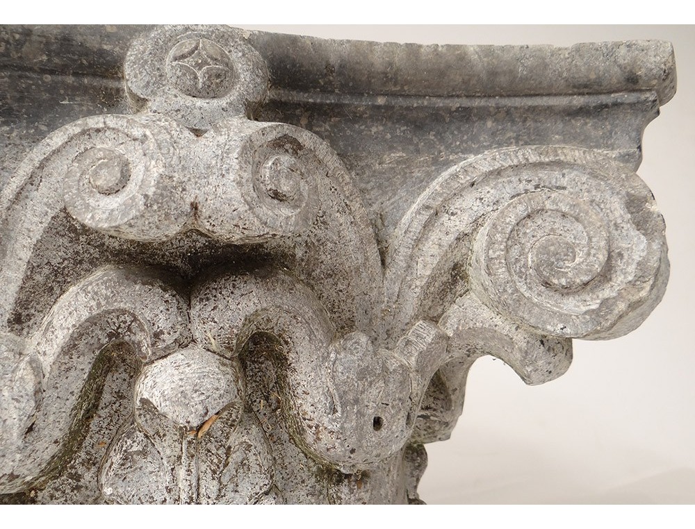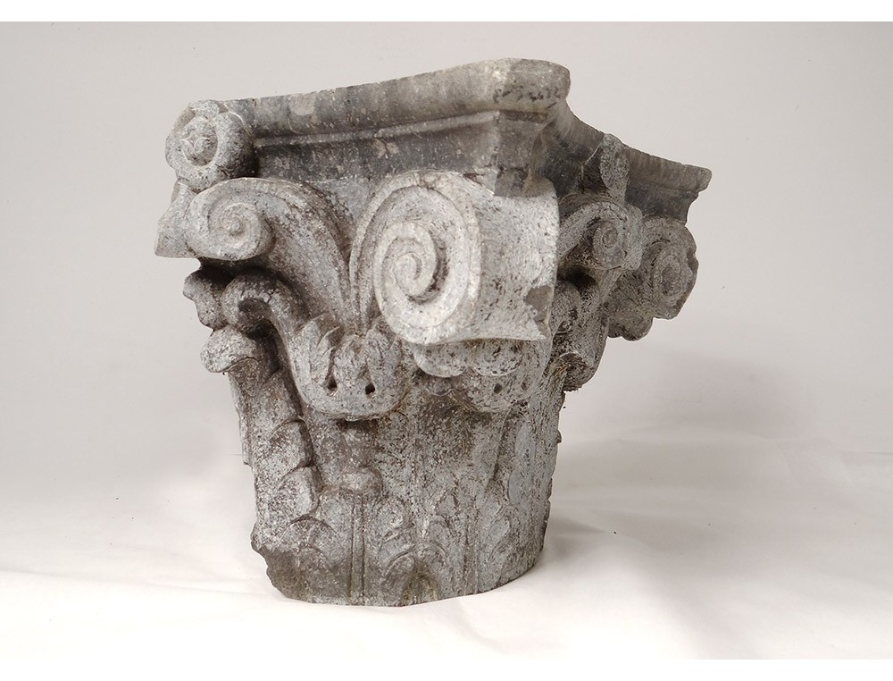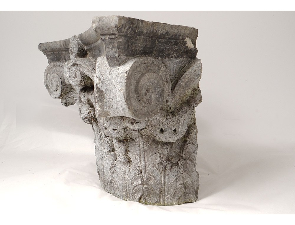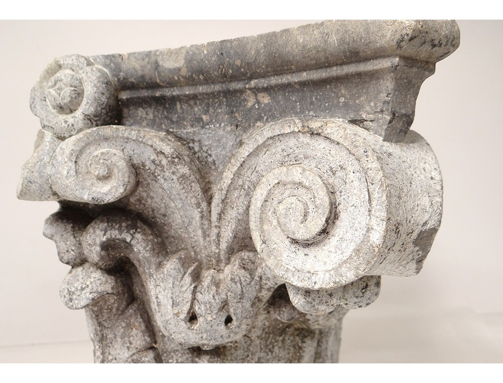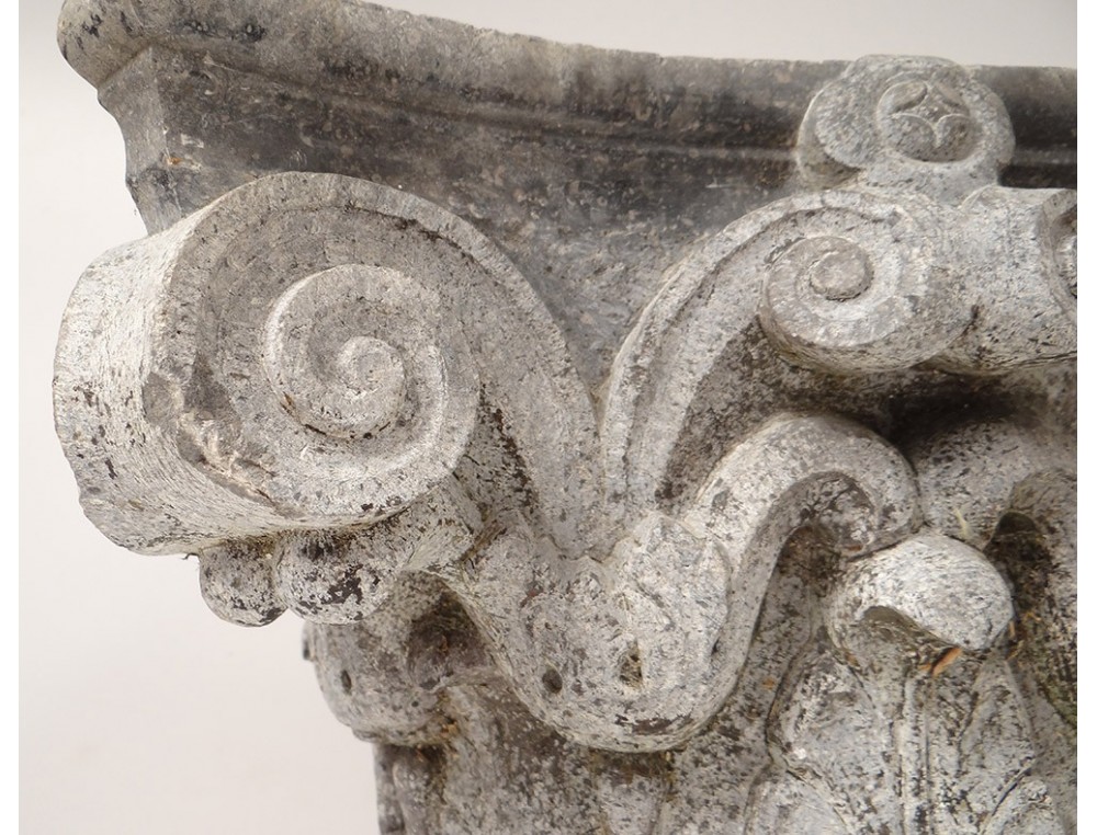 Gray marble sculpture representing a Corinthian capital with scrolls and acanthus leaves, vintage eighteenth century.