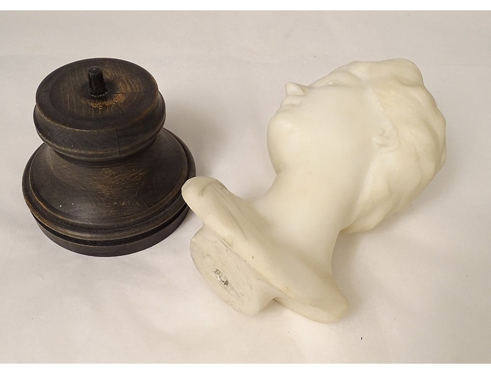 Sculpture in white Carrara marble, representing the bust of a beautiful young woman, blackened wooden base, Art Nouveau period late nineteenth and early twentieth centuries.