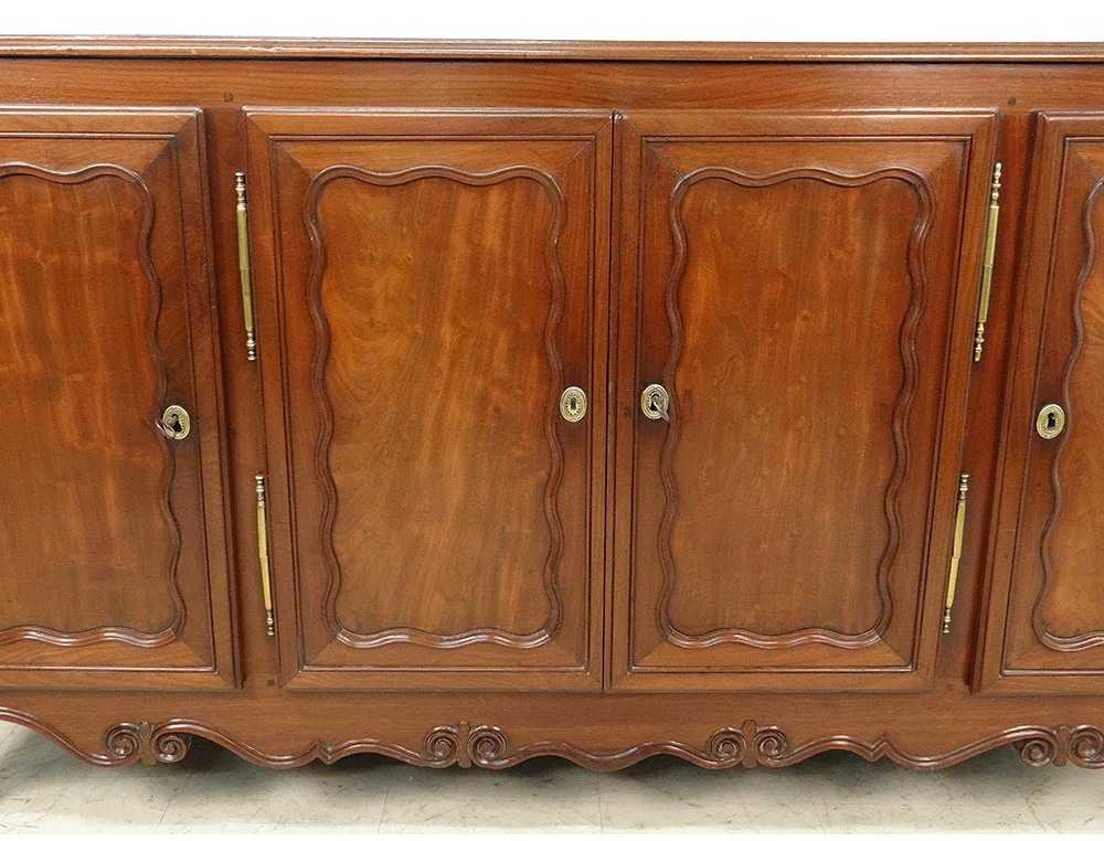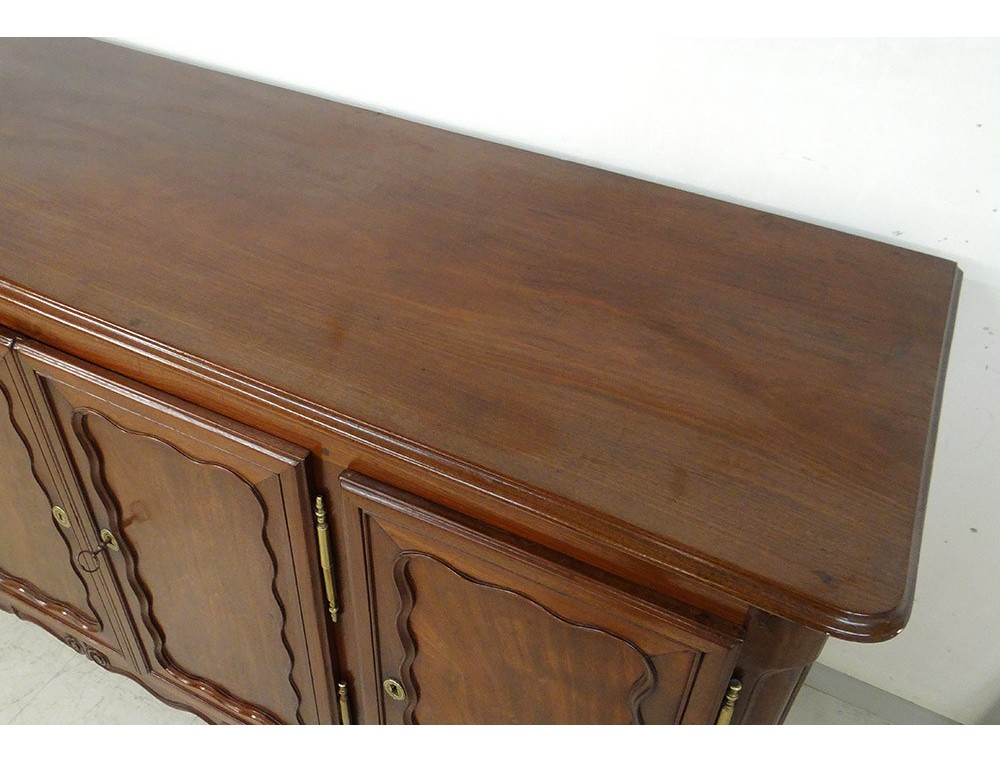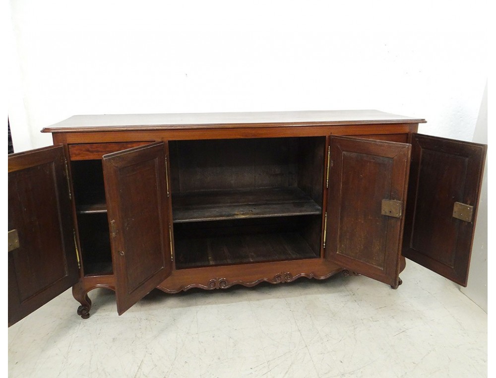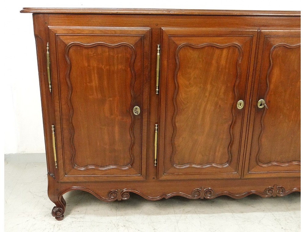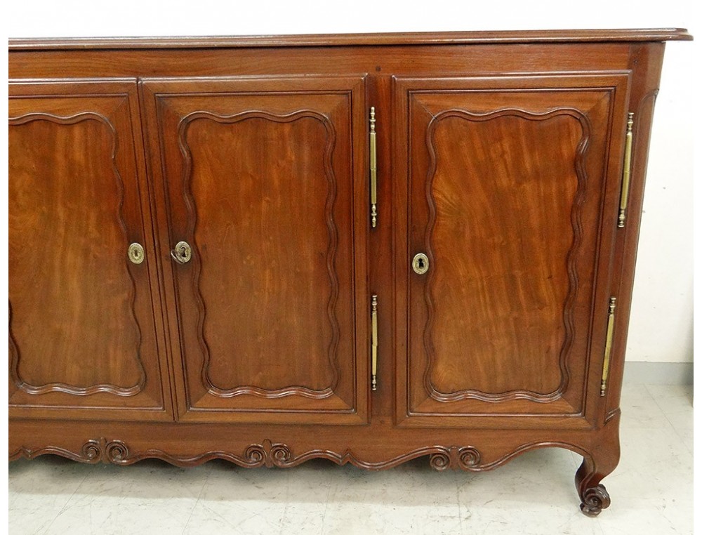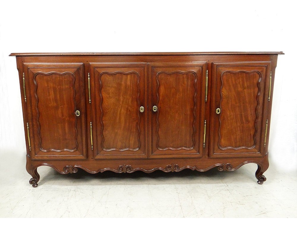 Buffet enfilade Louis XV Nantes, solid mahogany finely carved and molded, opening four doors concealing two small drawers, snails feet and scrolls in the low cross, vintage eighteenth century.