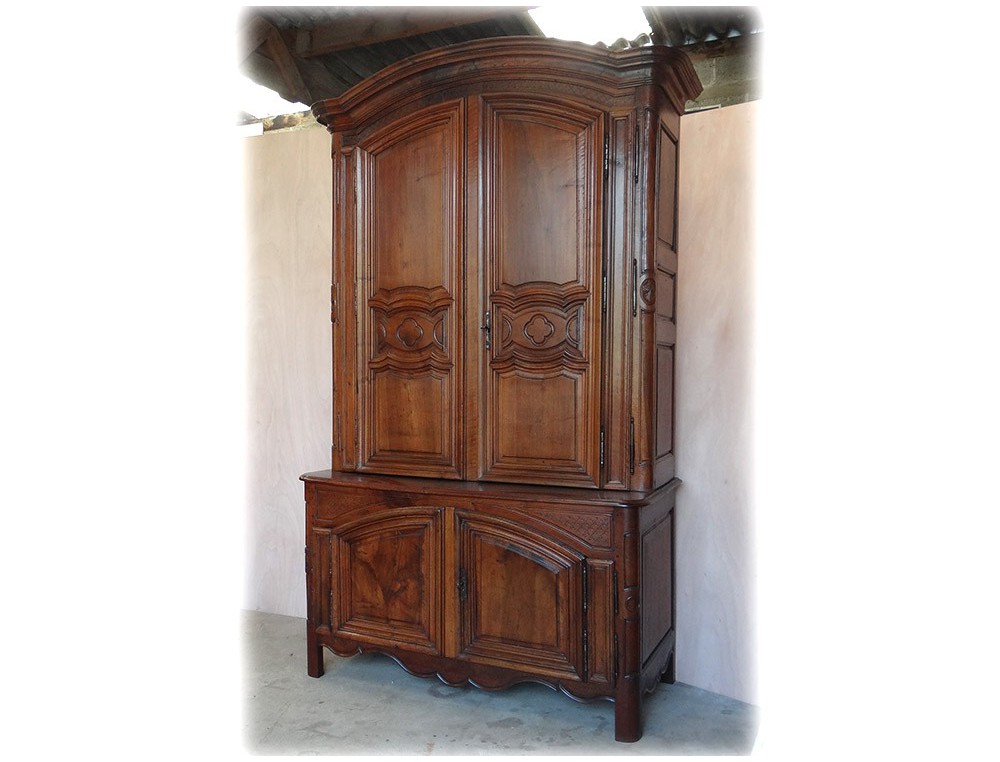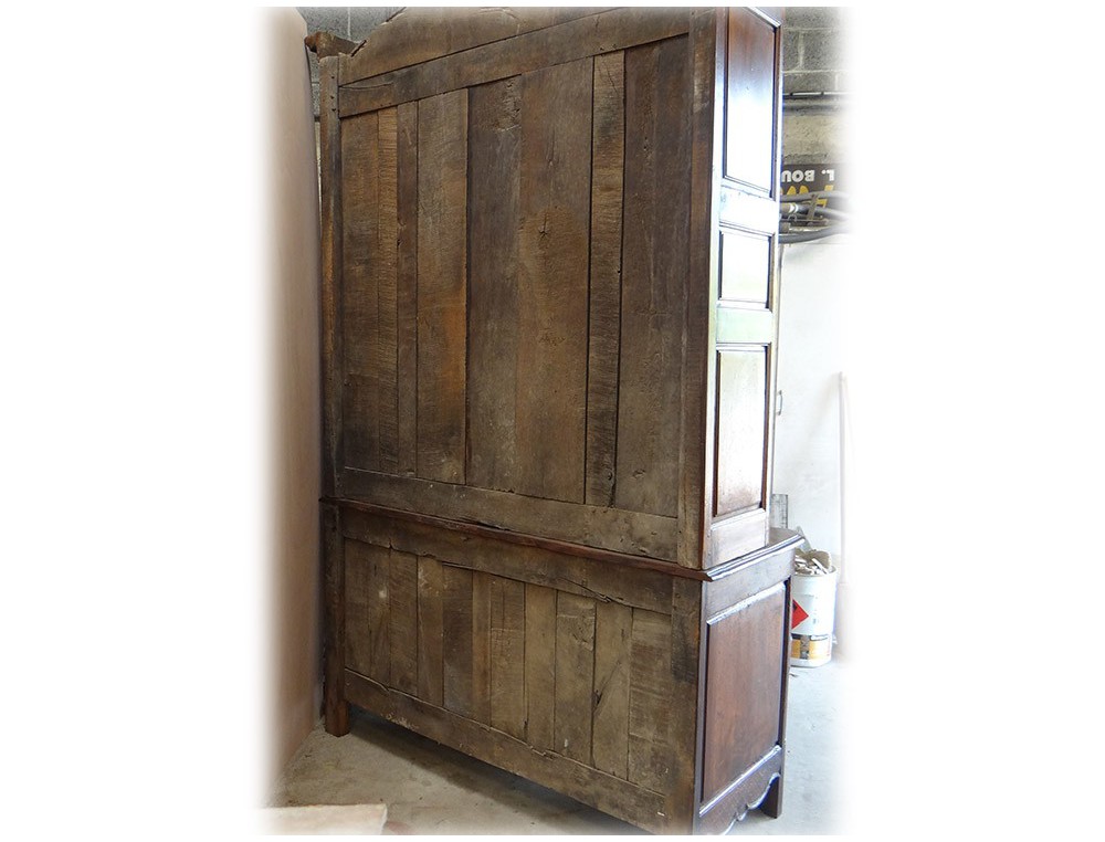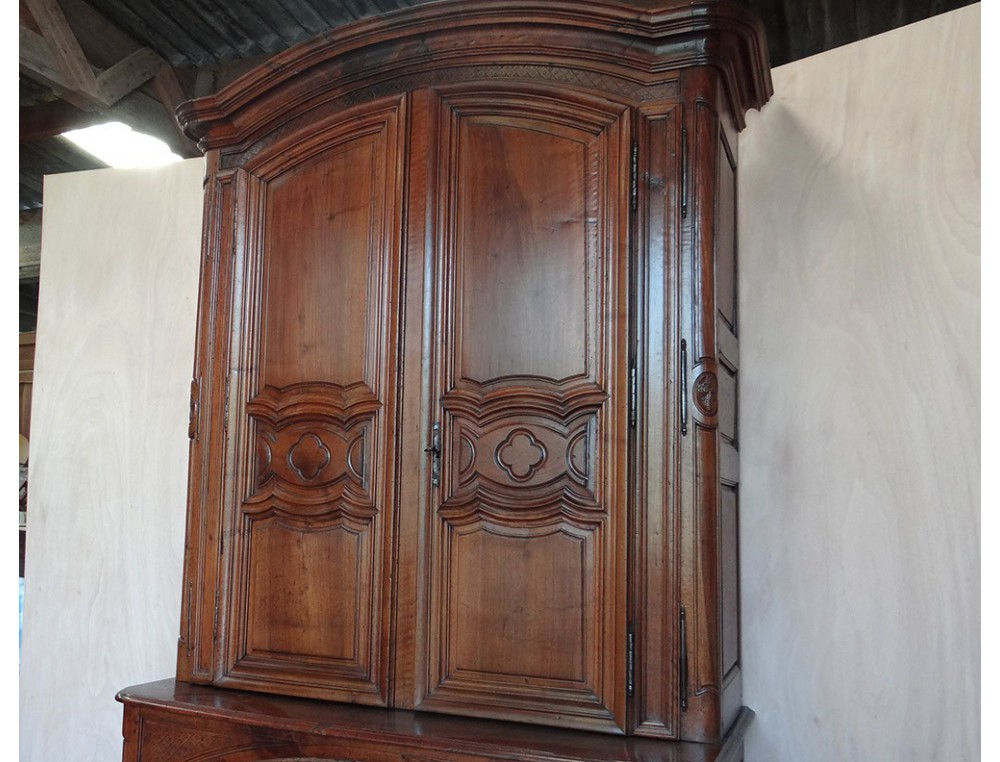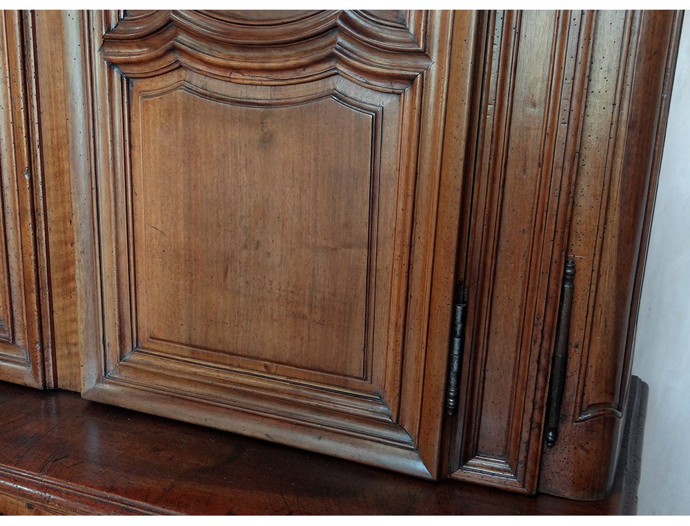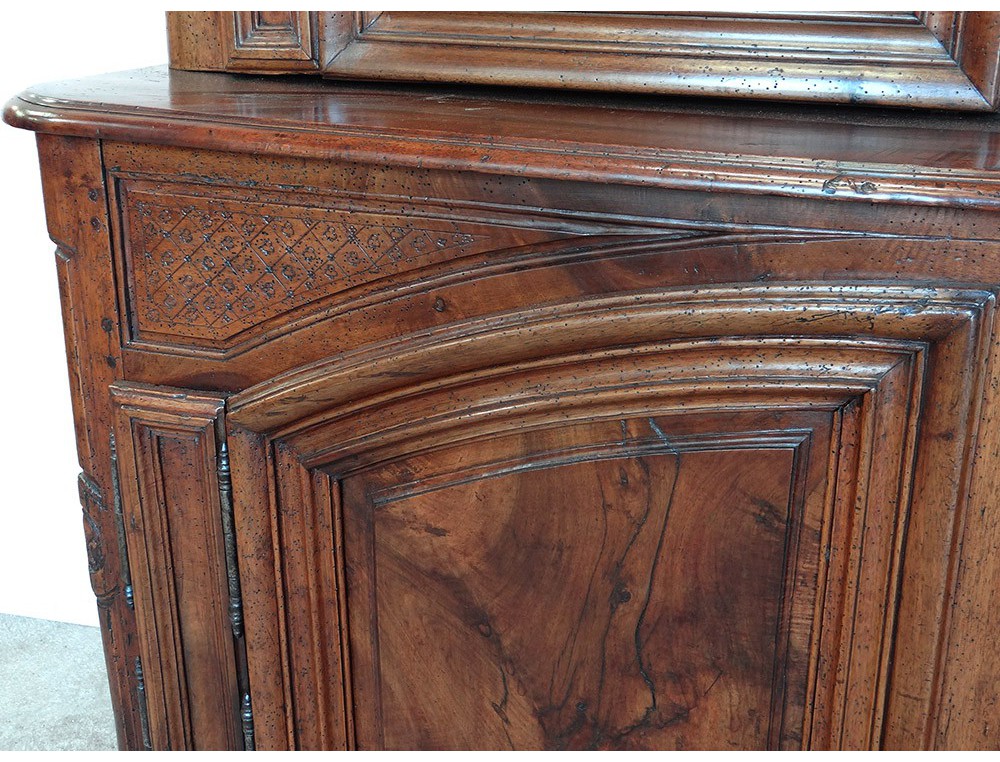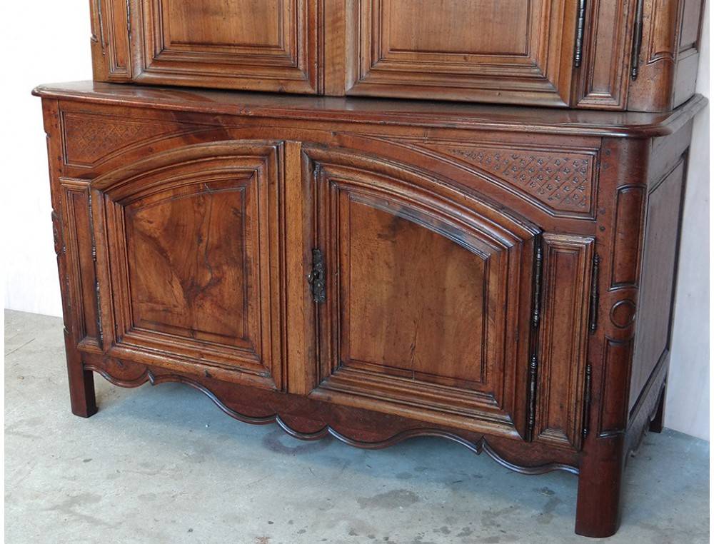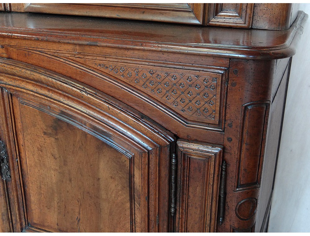 Buffet two-body walnut molded and finely carved small flowers, opening double doors at the top and bottom, doors called "double development", upper back wearing a cocked hat cornice, amounts low carved small lilies, locks and espagnolettes wrought iron, antique Louis XV -Louis XVIII century.