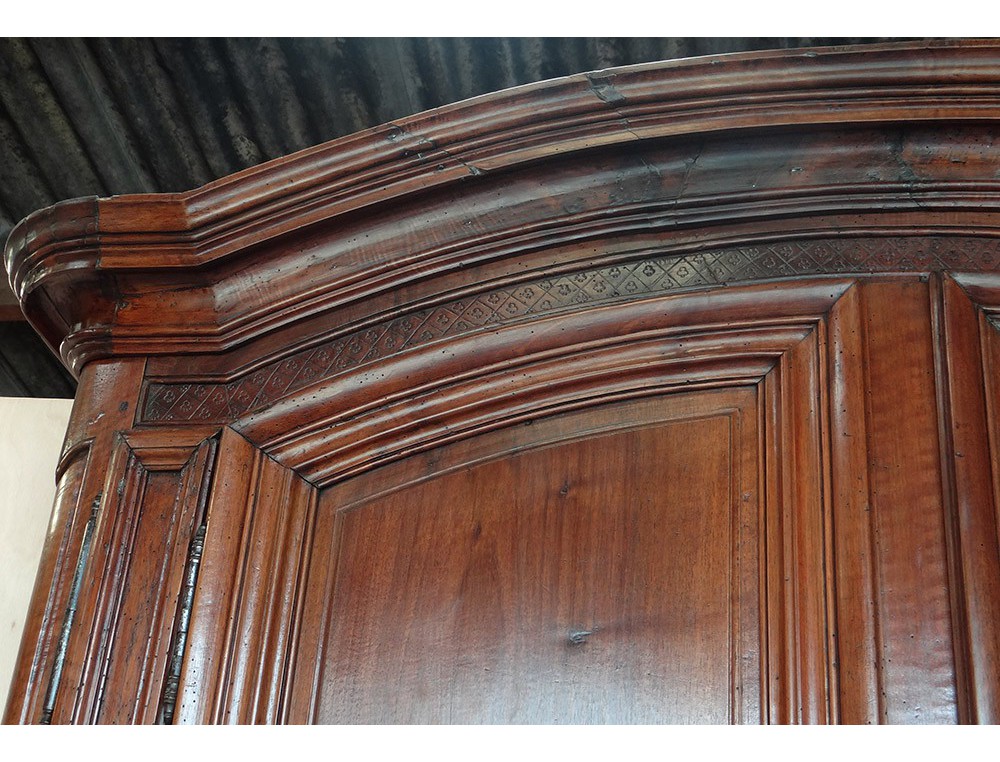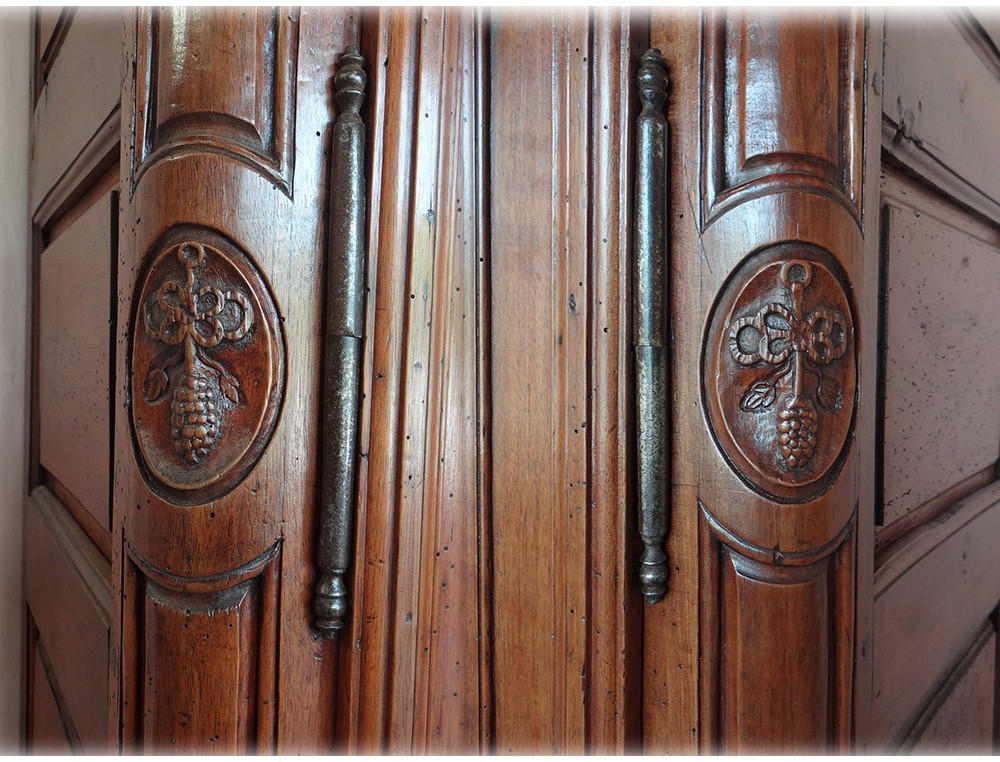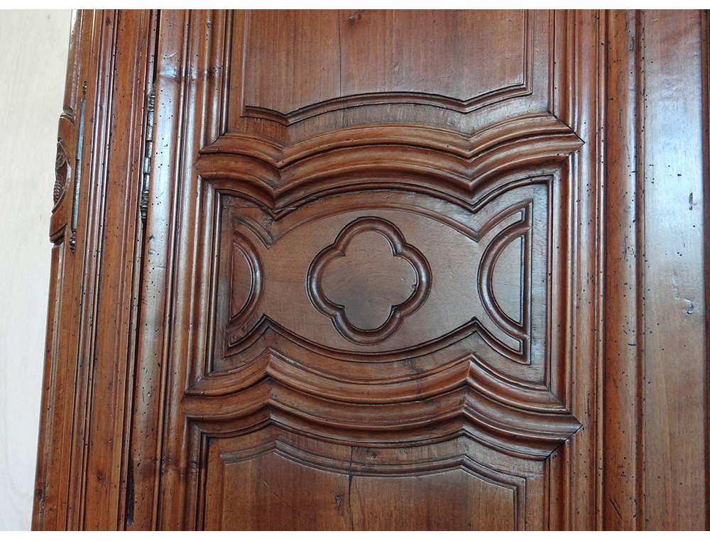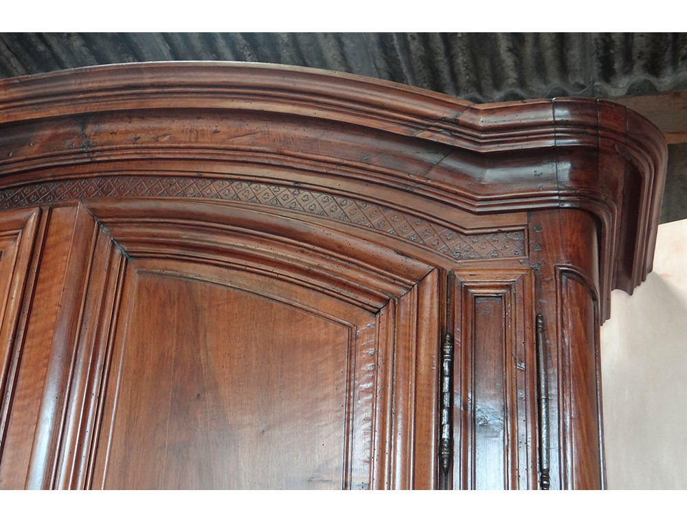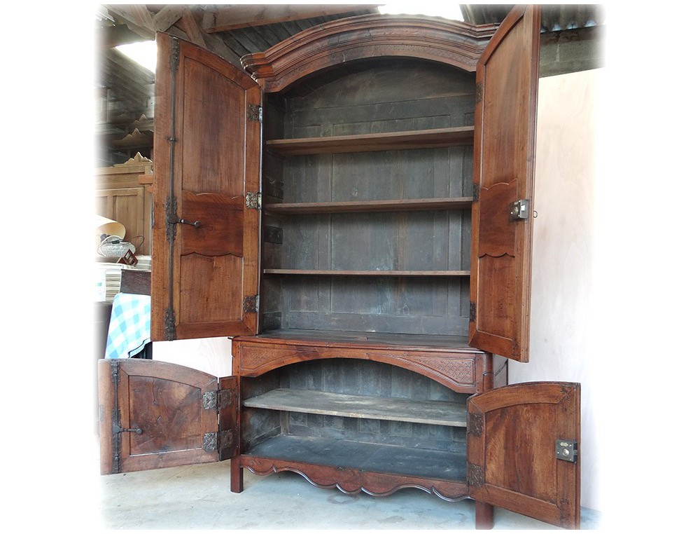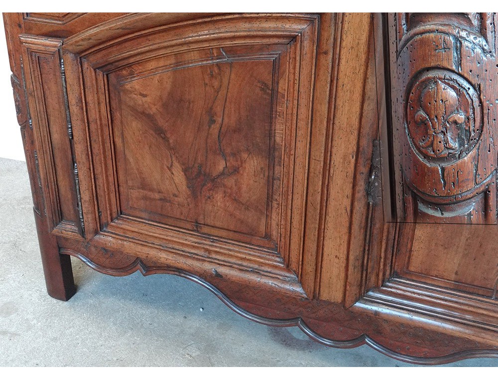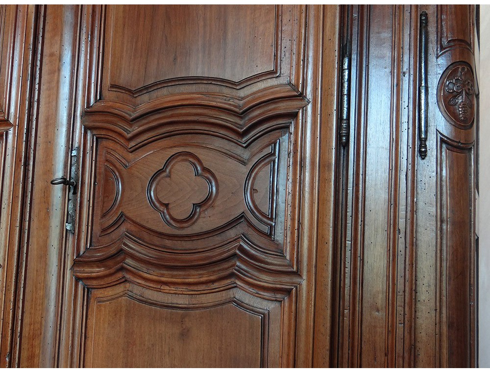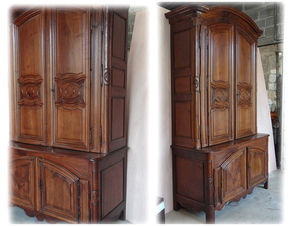 Buffet two-body walnut molded and finely carved small flowers, opening double doors at the top and bottom, doors called "double development", upper back wearing a cocked hat cornice, amounts low carved small lilies, locks and espagnolettes wrought iron, antique Louis XV -Louis XVIII century.