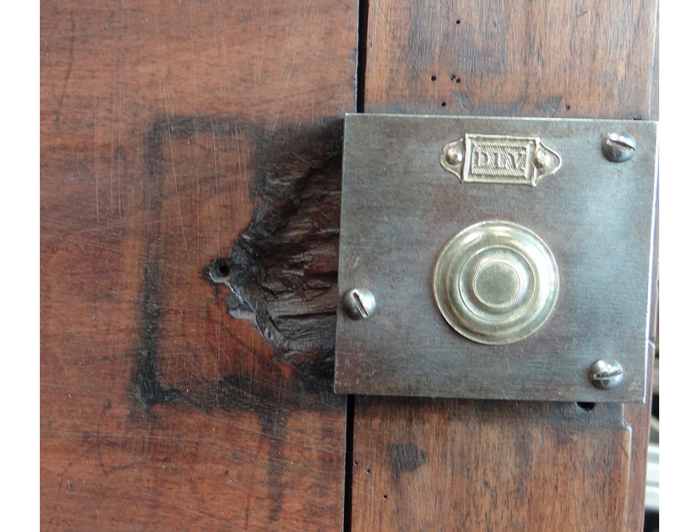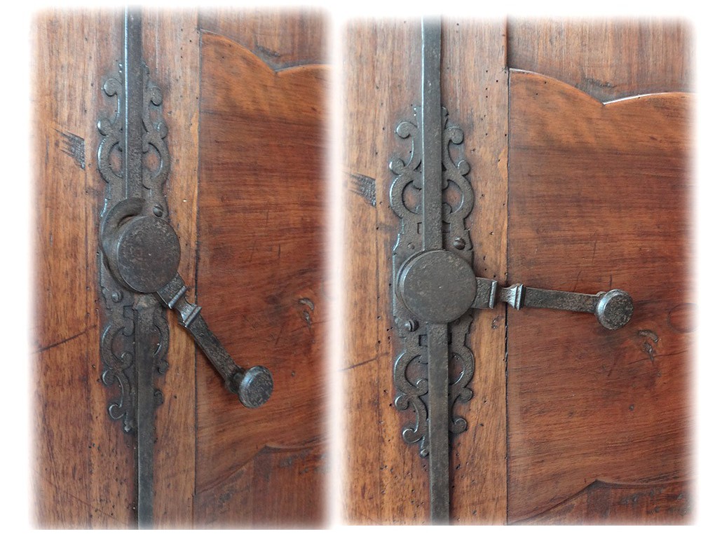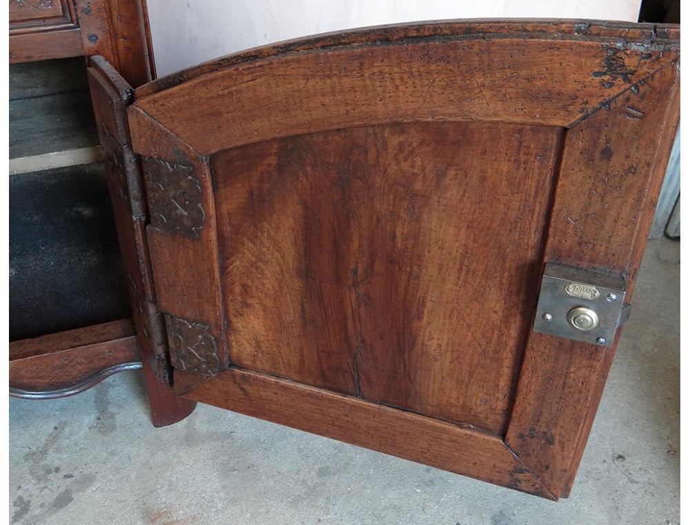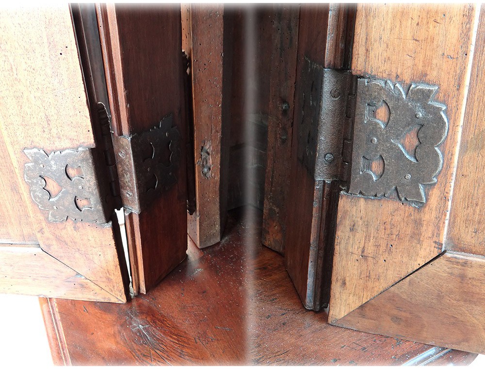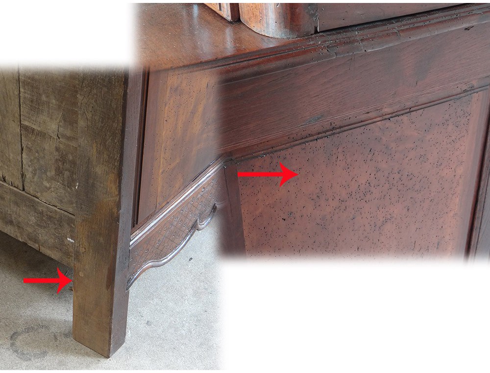 A note: a lily (right side) is almost erased his medallion, traces of ancient worm holes (including the sides), some minor accidents, slots and scratch time, missing two hinges heads high side part right, réentés feet, wear time, well look at the pictures (see red arrows).