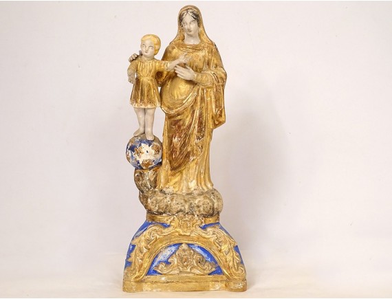 Virgin of Marseille or santibelli * in polychrome and gilded terracotta, representing the Virgin Mary with the Child Jesus by her side, standing on a terrestrial globe decorated with stars, vintage late 19th-early 20th centuries.