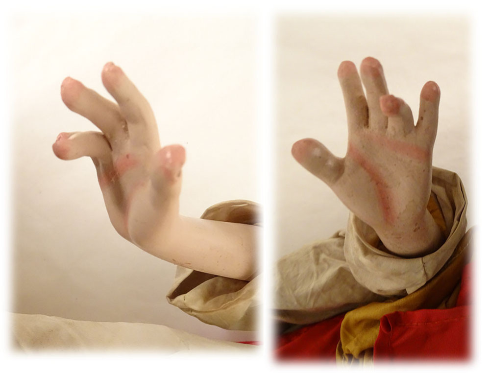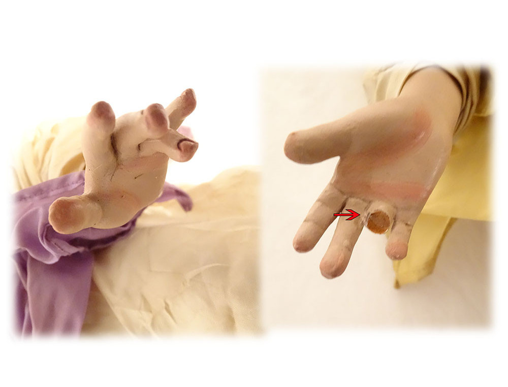 Please note: one angel is missing a finger (see red arrows), some scratches, dirt, stains and wear from time, take a good look at the photos. A file of additional detailed photos is available for download below.