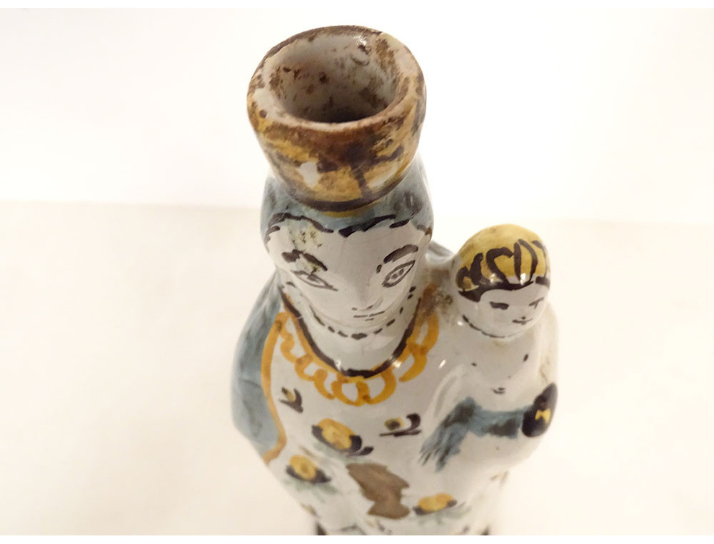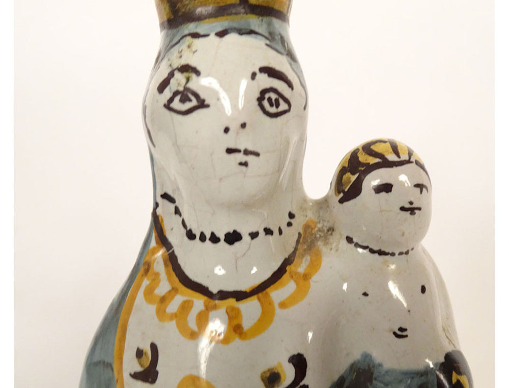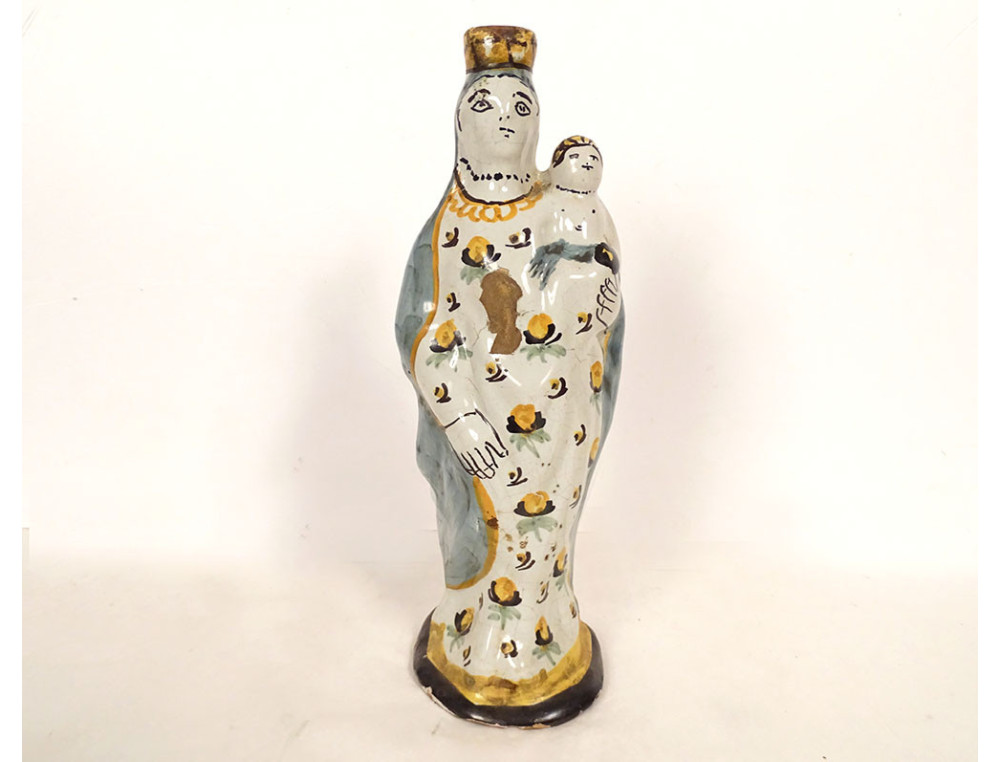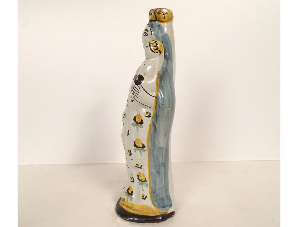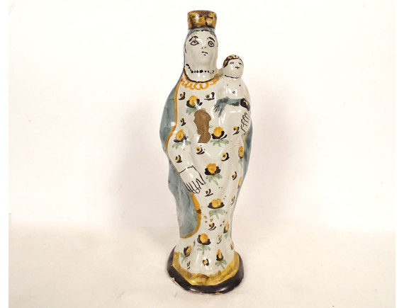 Crowned Virgin Mary after childbirth holding the Infant Jesus on her left arm, in polychrome Nevers faience, from the 18th century.