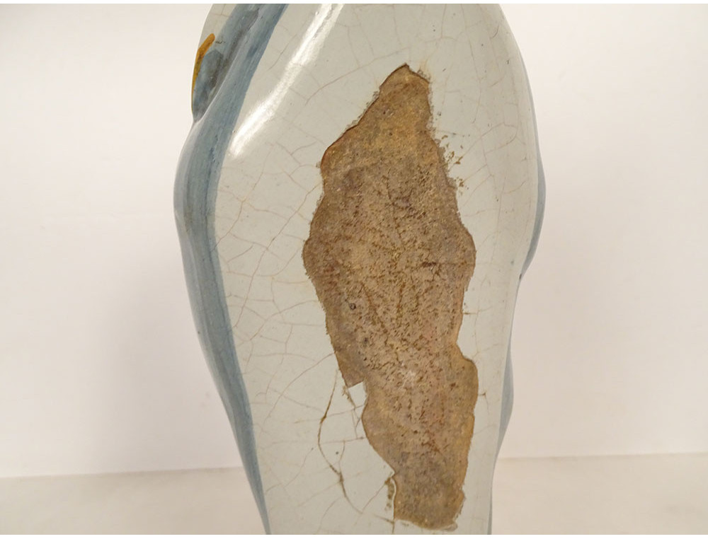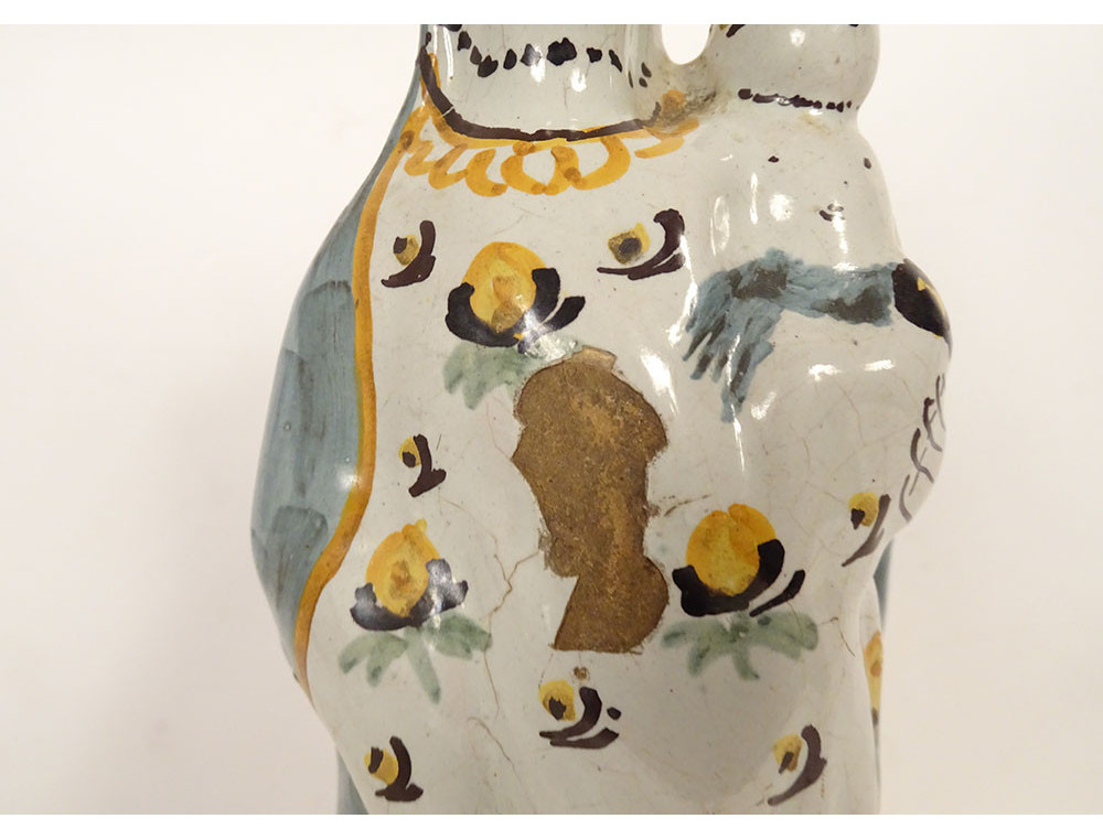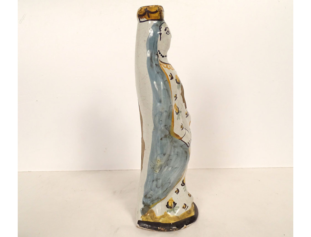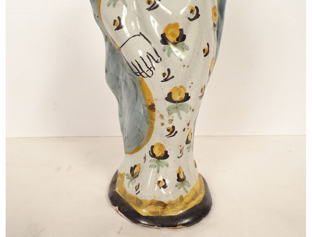 Crowned Virgin Mary after childbirth holding the Infant Jesus on her left arm, in polychrome Nevers faience, from the 18th century.
