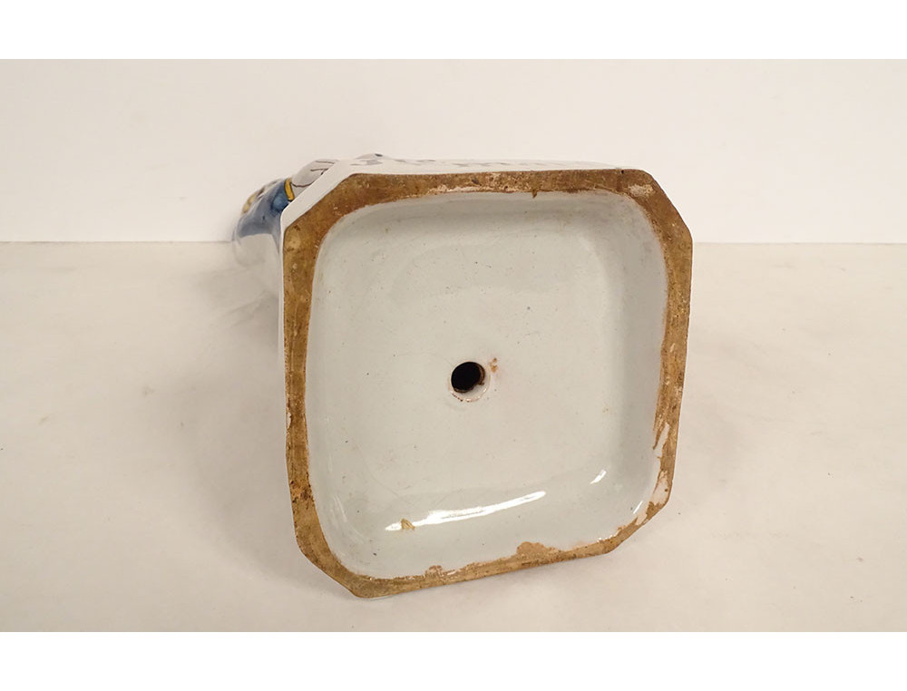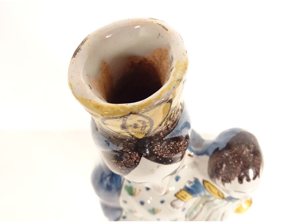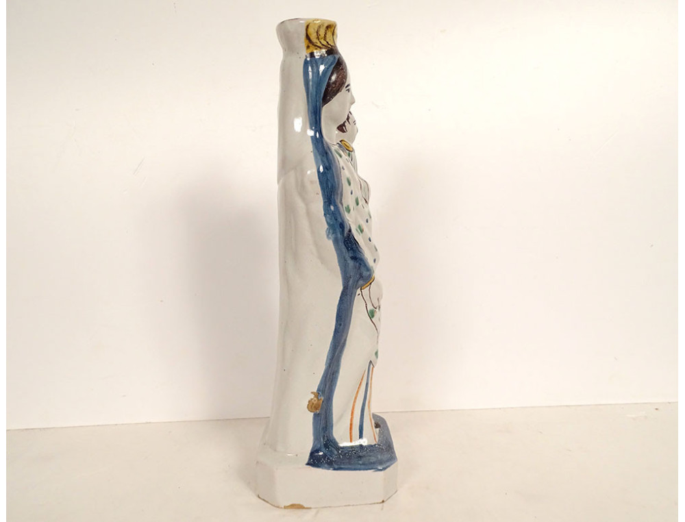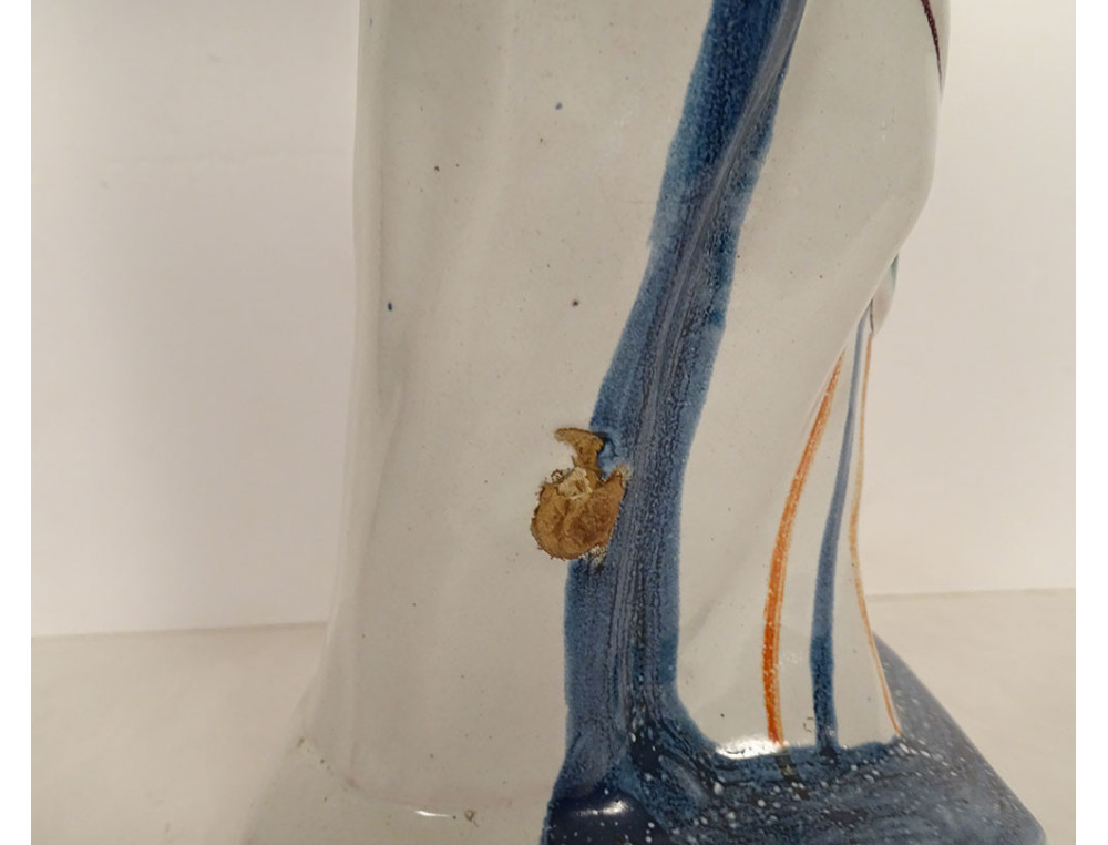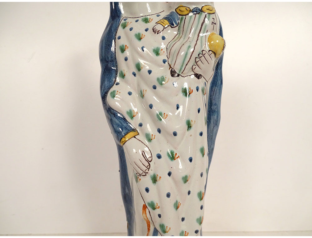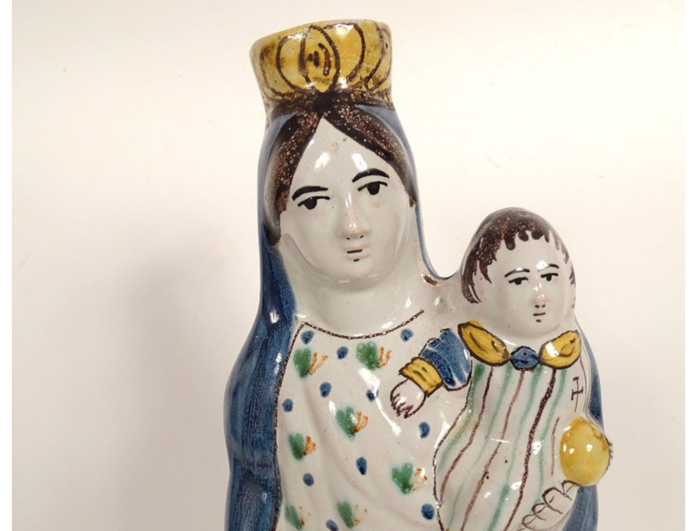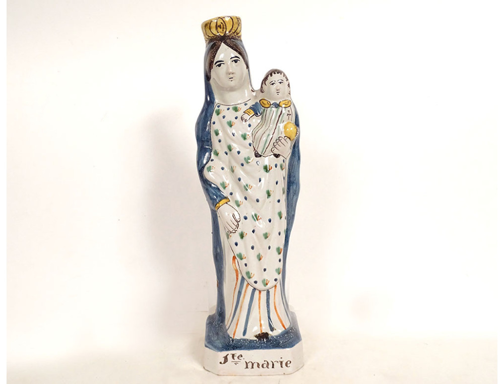 Crowned Virgin Mary after childbirth holding the Infant Jesus on her left arm, marked Ste Marie PPN (Pray For Us), in polychrome Rennes earthenware, from the 18th century.