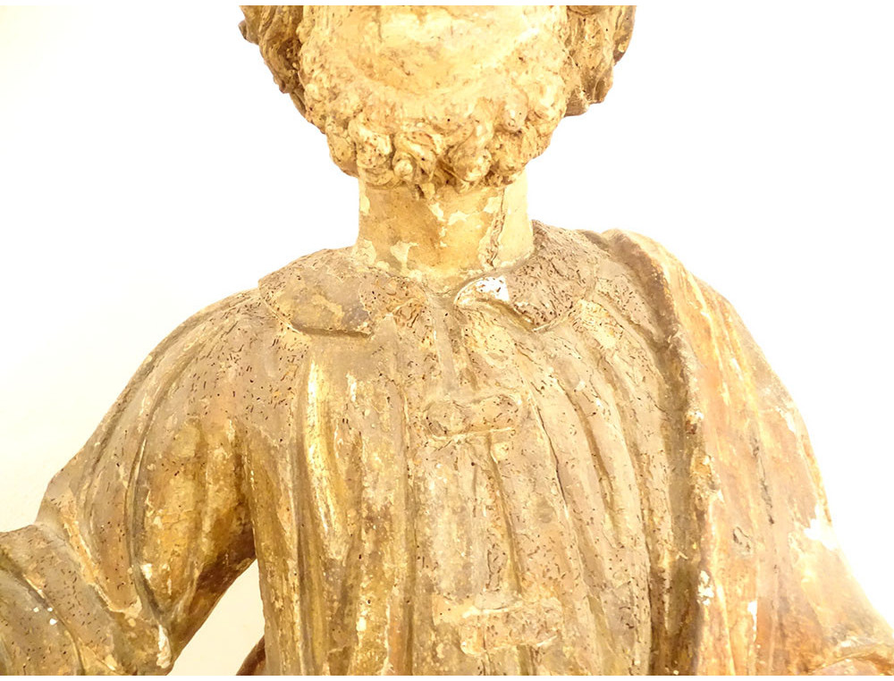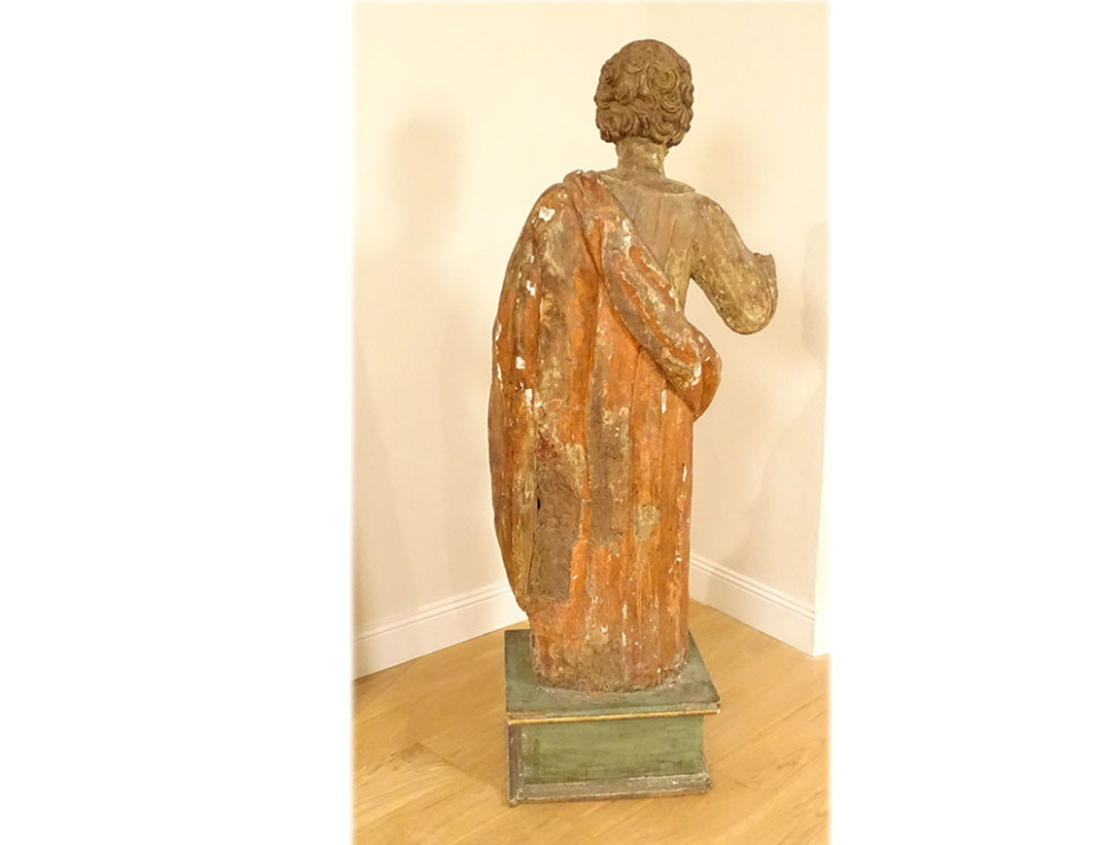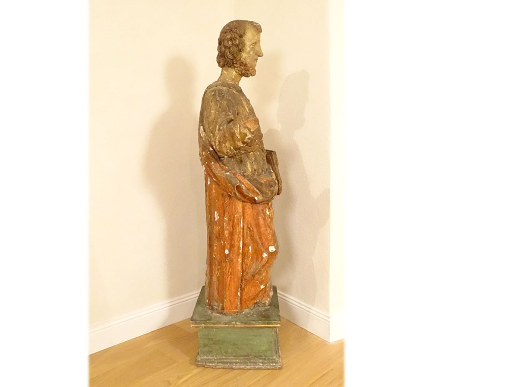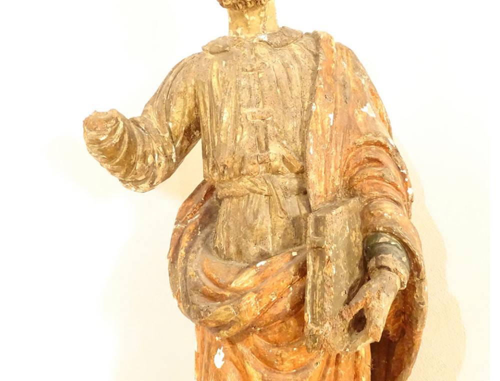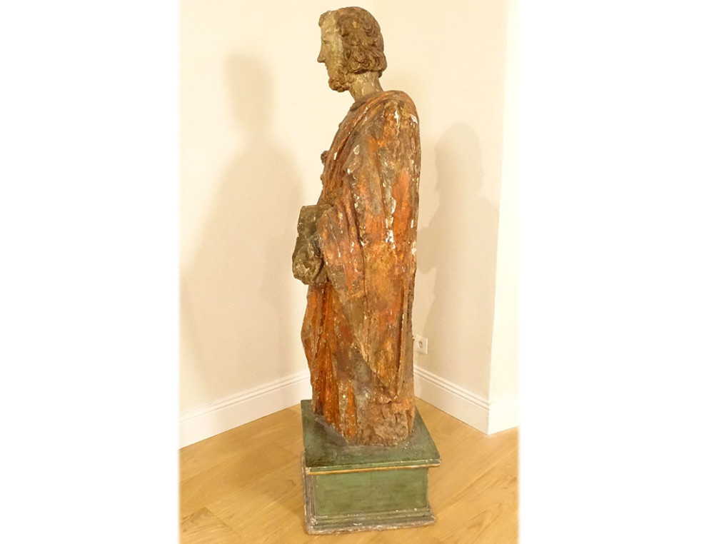This statue is in good overall condition, in its original state. The right hand of the saint, which held the keys to Paradise (a classic representation of Saint Peter), is missing. The base is a later addition.