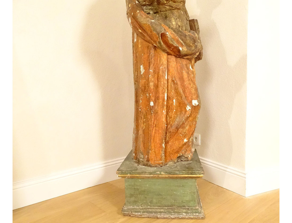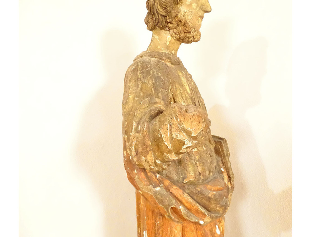 Large polychrome carved wooden religious statue representing Saint Peter holding the Bible in his left hand, his right arm raised, his ochre-red cloak falling in wide drapes, from the 17th century.