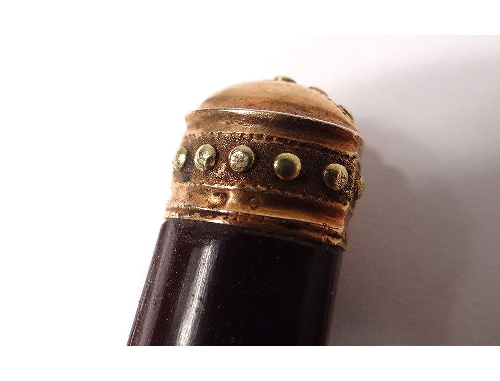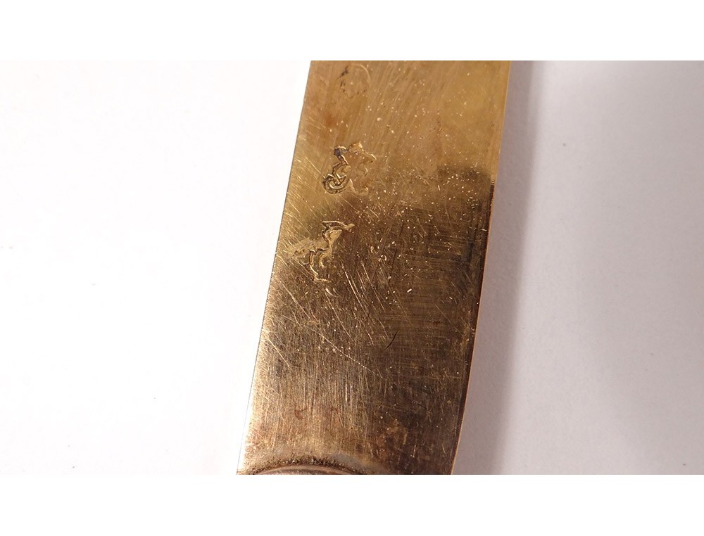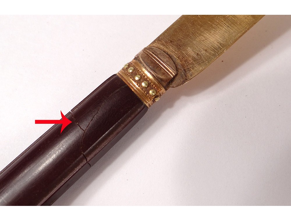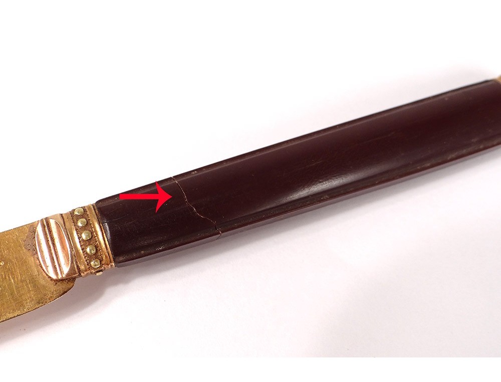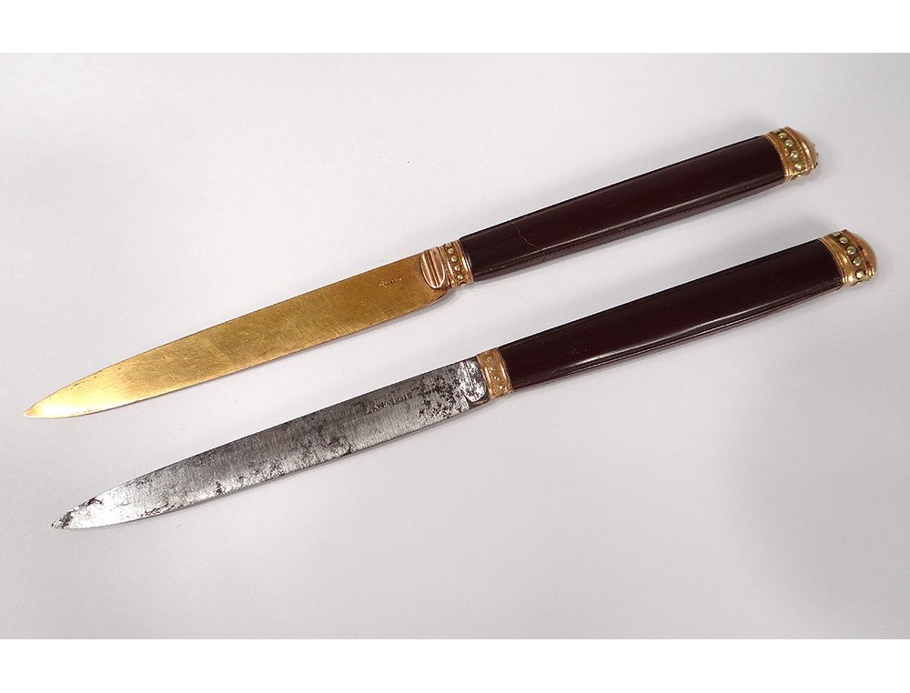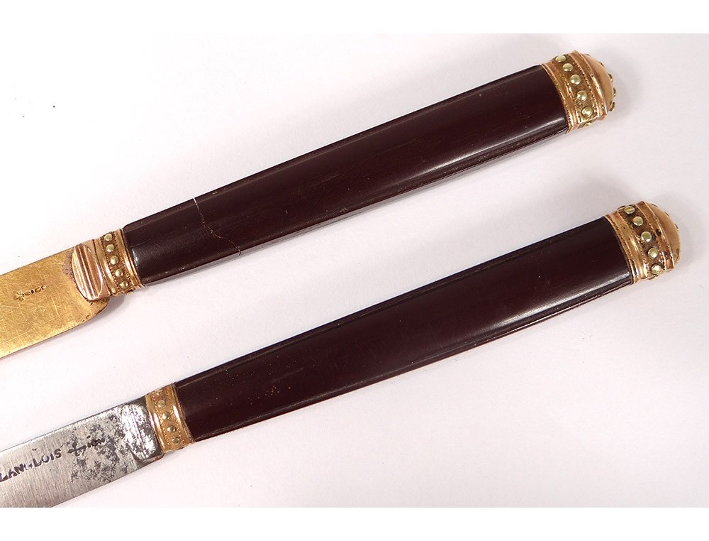 Two travel knives (fruit or dessert), handle in composition (imitating amber), vials in solid gold chased in two colors, one with steel blade signed Langlois (Coutelier du Roi), the other in solid gold, from the 18th century.