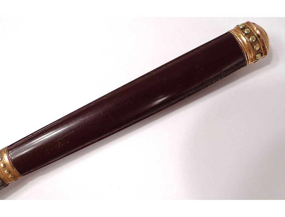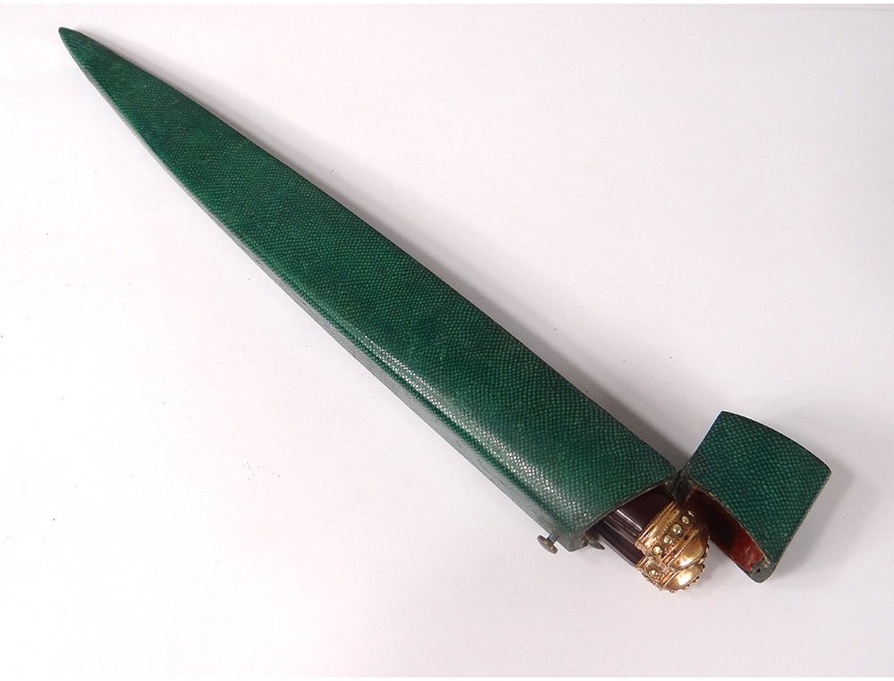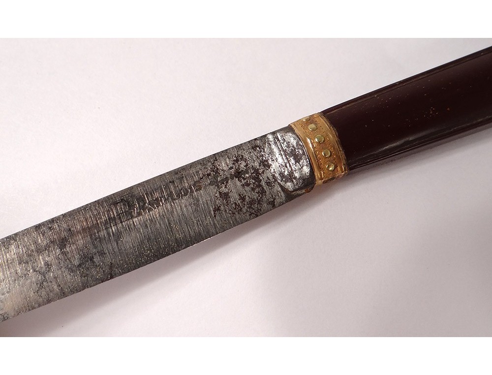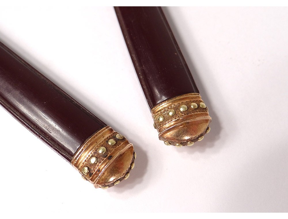 These knives are in good condition and are of high quality. They have their travel case. Traces of punch on the tip and punches on the gold blade