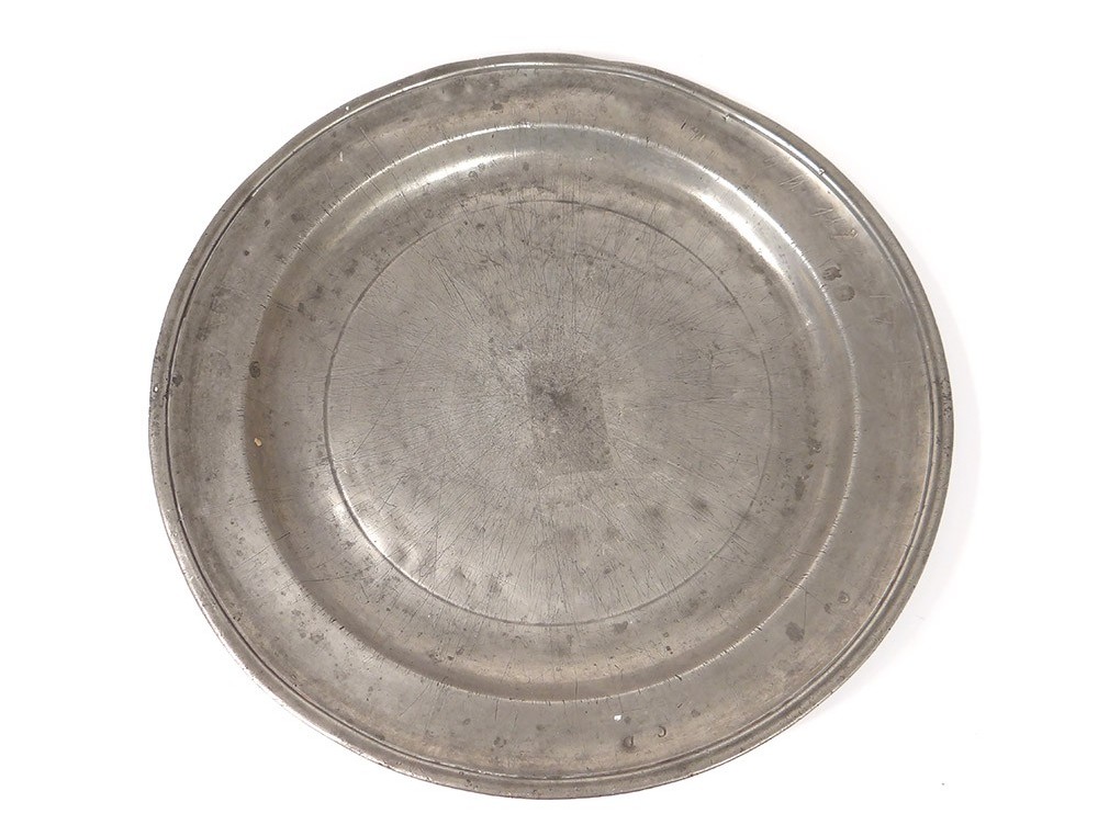 Round flat pewter, with punches (illegible), engraved date 1671 (regraved in 1873), monogram CD on the edge, vintage XVIIth century.