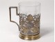 Cup holder or cup holder in Russian silver finely chiseled, openwork and niellé foliage decor and flowers, punch 875 with sickle and maarteau (from 1958), with its silver spoon enhanced with polychrome enamels, vintage second half twentieth century.