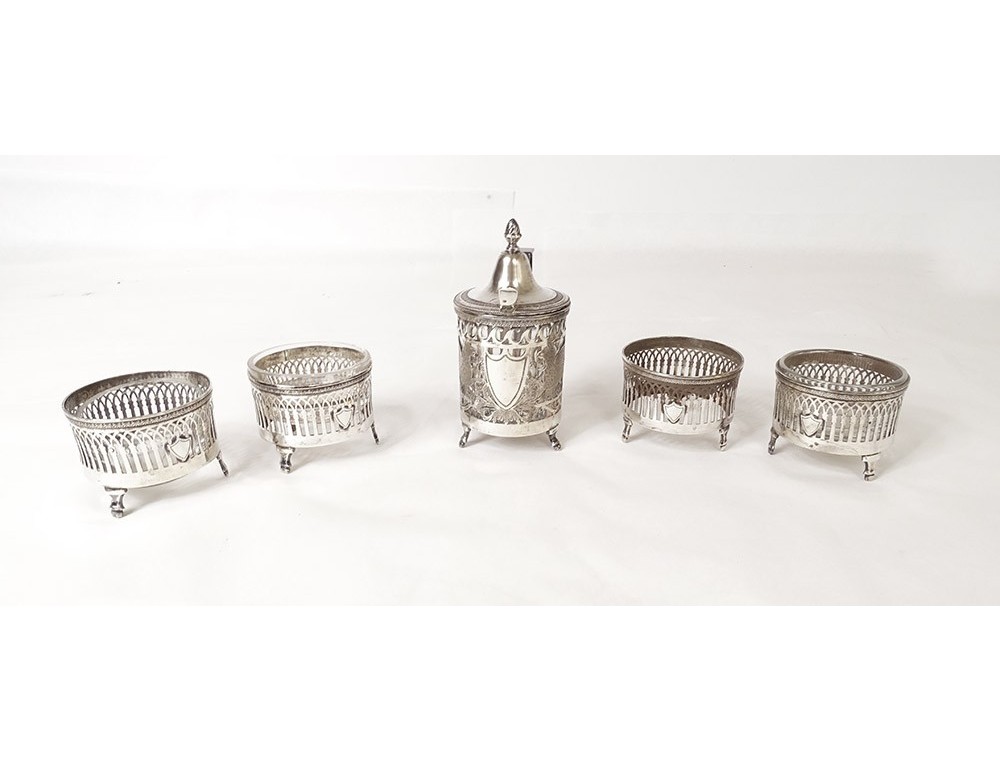 Set of four salt cellars and a finely chiseled solid silver mustard bowl, the mustard bowl is decorated with two phoenixes. 1st rooster hallmark. XIXth century.