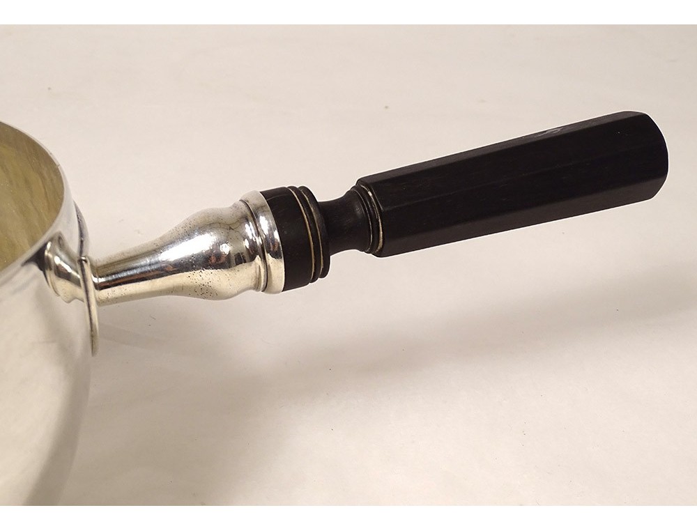 Solid silver saucepan, carved ebony handle, Minerva punch (1st title) and Governore silversmith, vintage late nineteenth and early twentieth centuries.