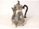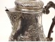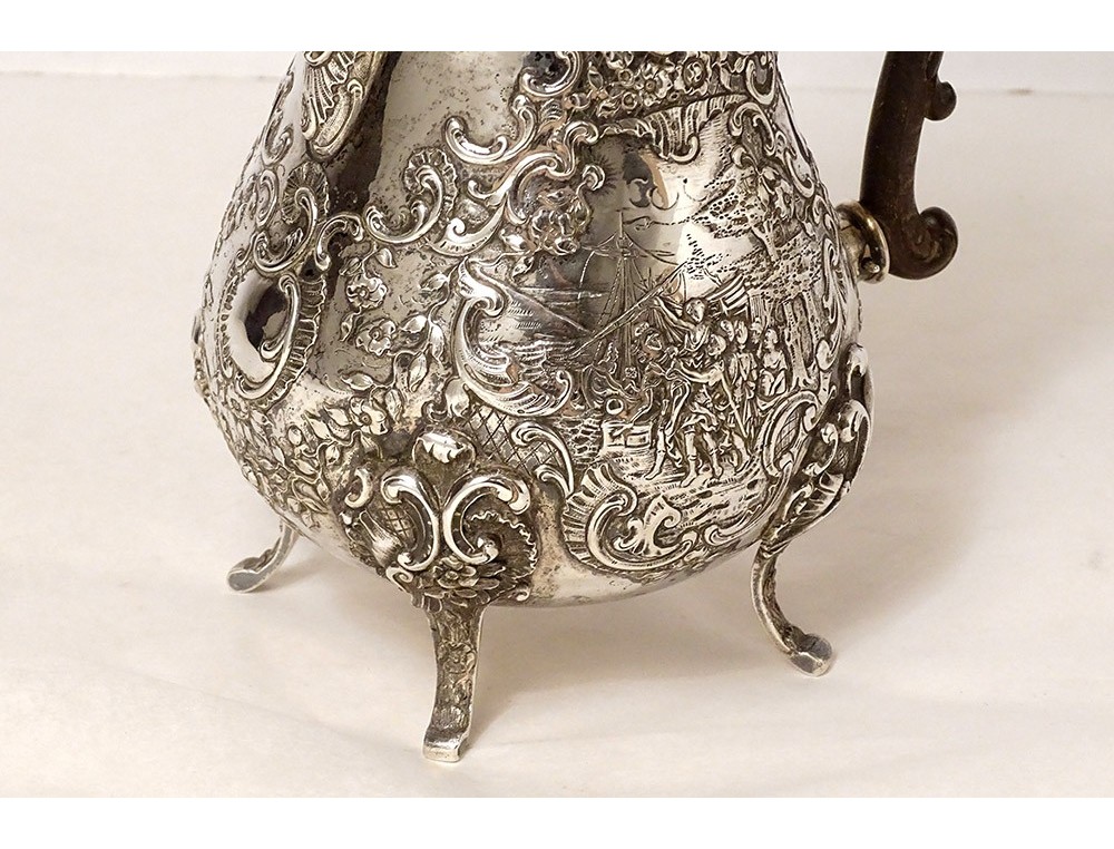 Fully and finely chiseled solid German silver jug, richly decorated with two historical or mythological scenes animated by numerous characters, surrounded by foliage patterns, small flowers and stylized shells, import hallmark (weevil) and silversmith Storck & Sinsheimer * in Hanau, carved wooden handle, vintage late nineteenth and early twentieth centuries.