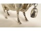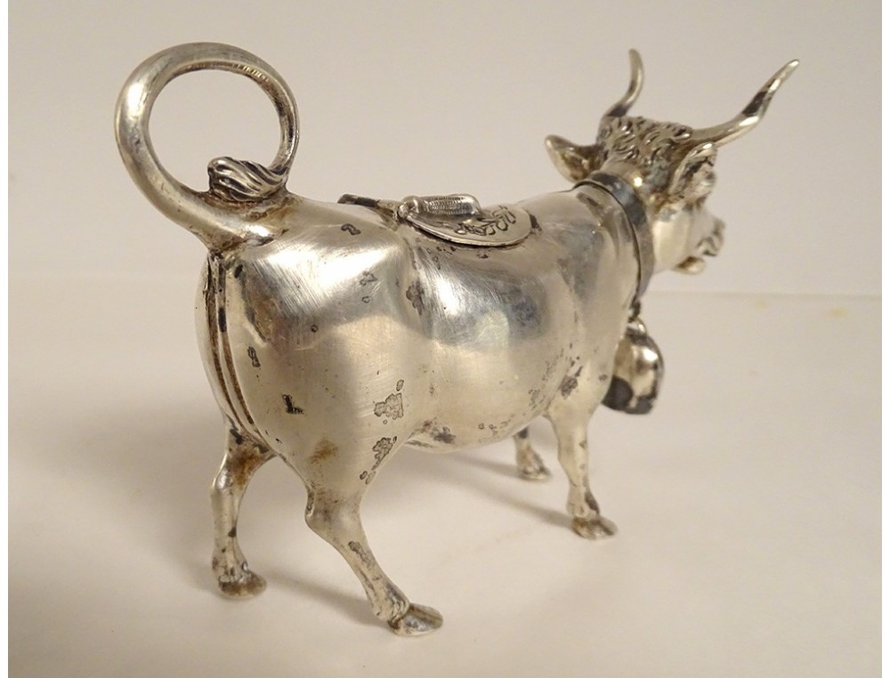 Small cream jug in German solid silver (crown and moon hallmark and 800 hallmark) in the shape of a cow with its bell around its neck, from the late 19th and early 20th centuries.