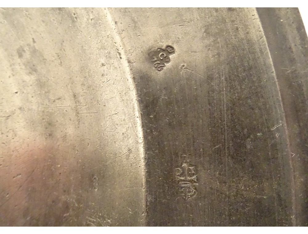 Round pewter dish, with monogram stamp on the base, vintage late 18th century.