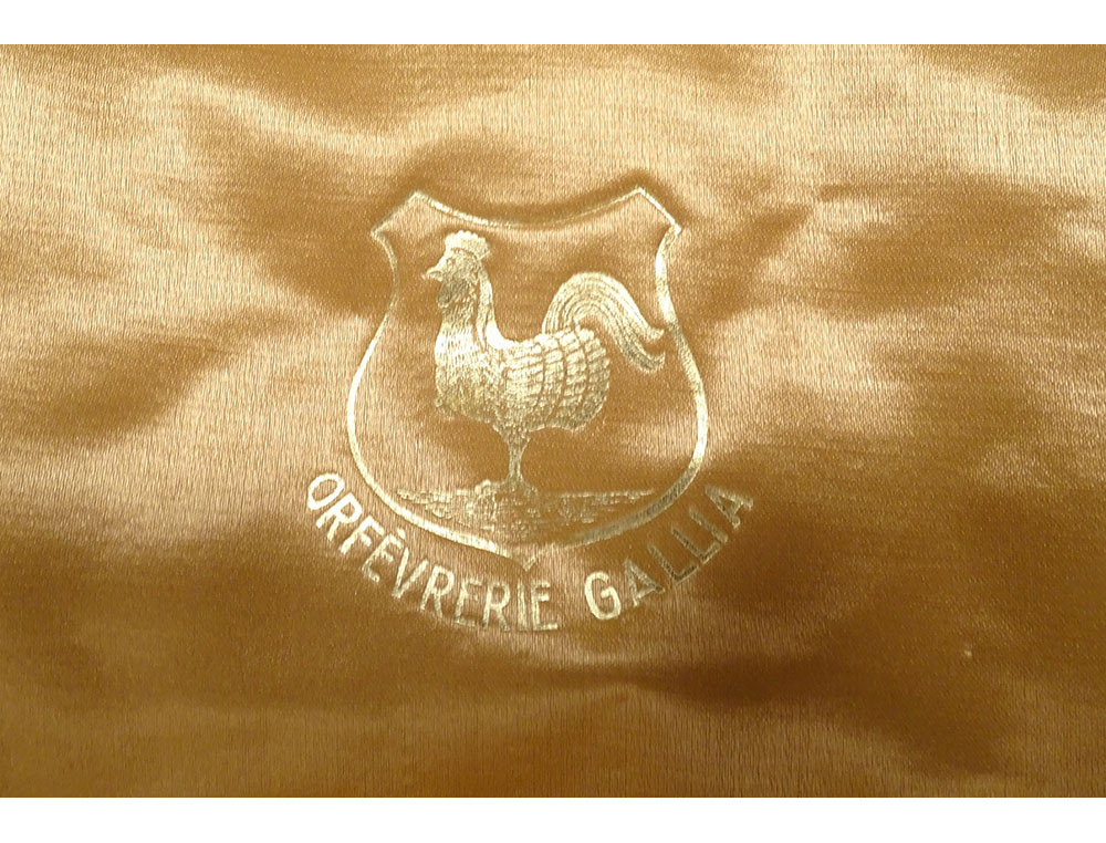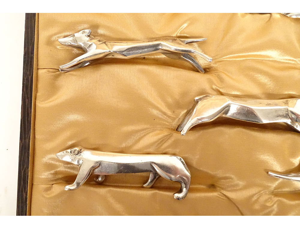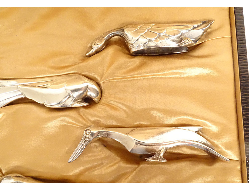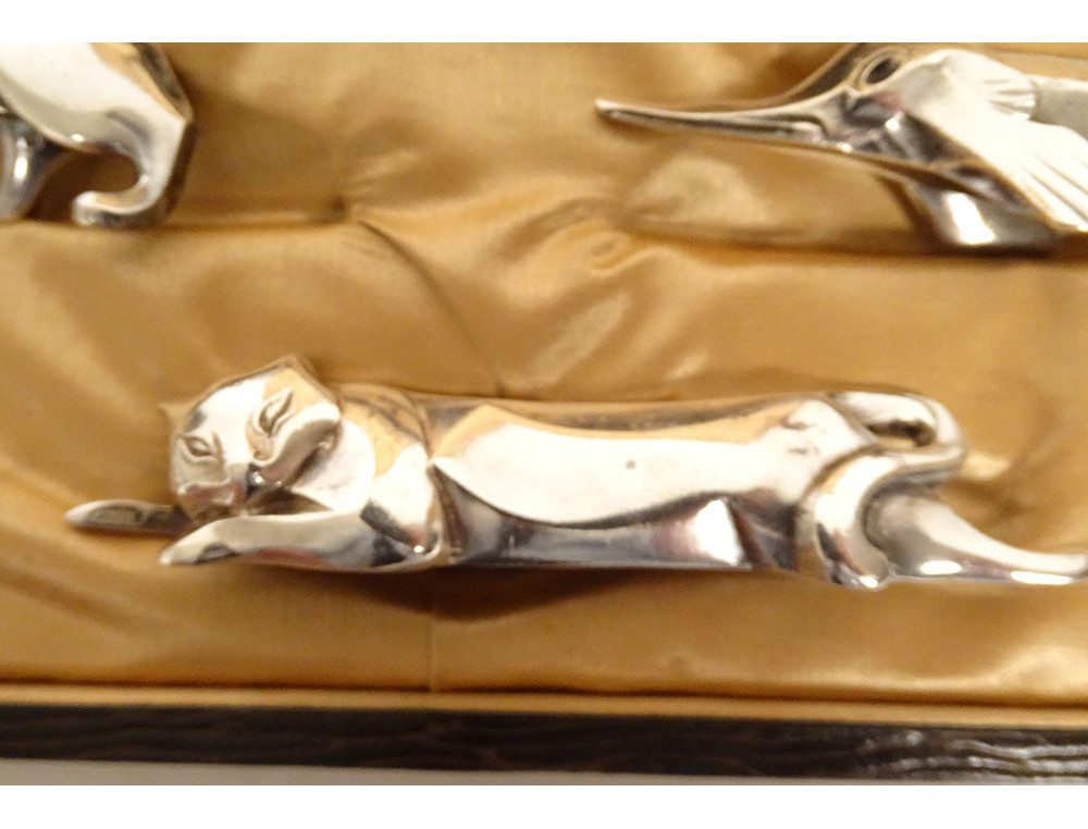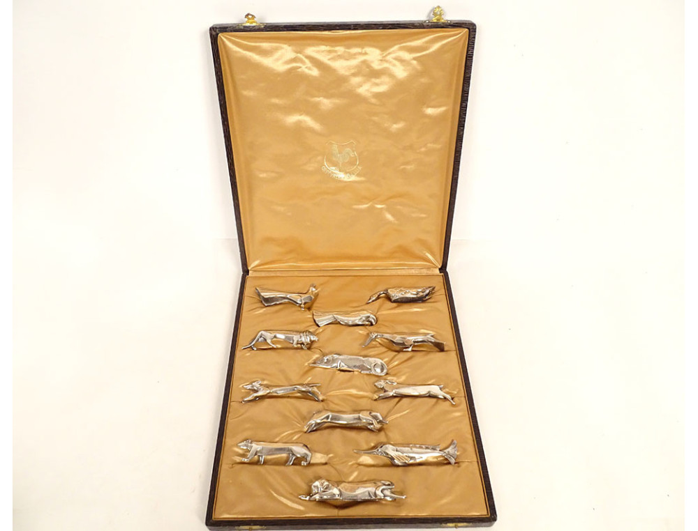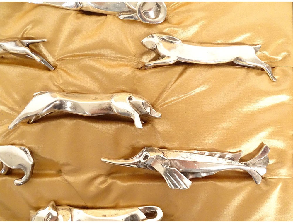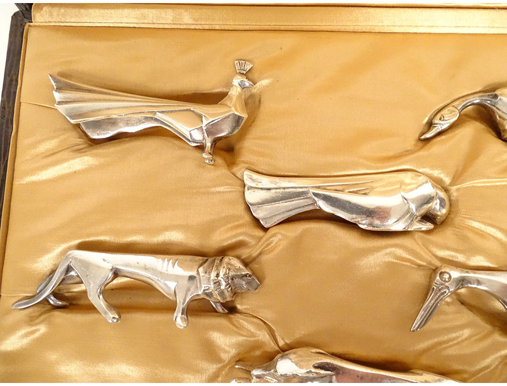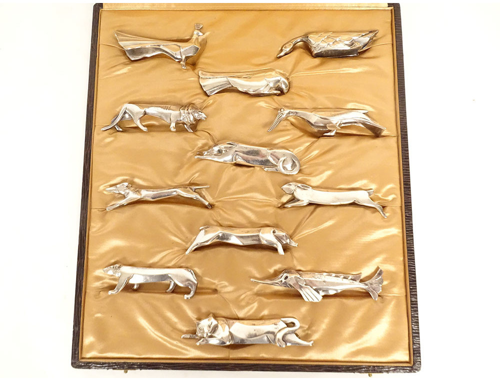 Set of 12 silver-plated knife rests, signed by Maison Gallia (Christofle), model created by Edouard-Marcel Sandoz*, representing animals: peacock, swan, dove or partridge, lion, pelican, lying dog, greyhound, hare, pig, bear, fish (swordfish), cat, in their original box, from the Art Deco period of the 20th century.