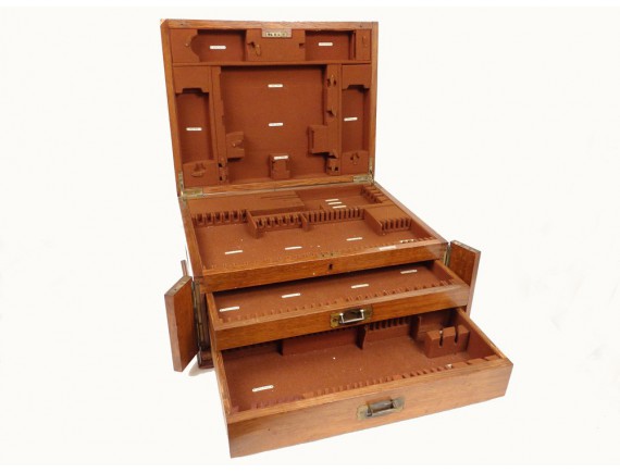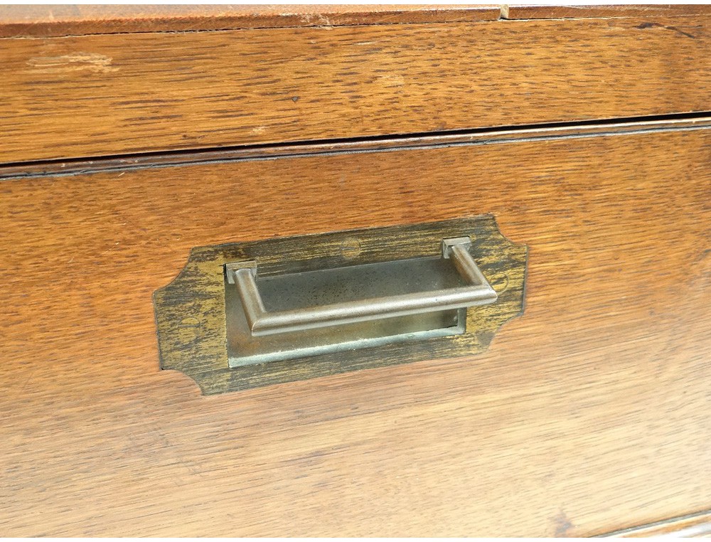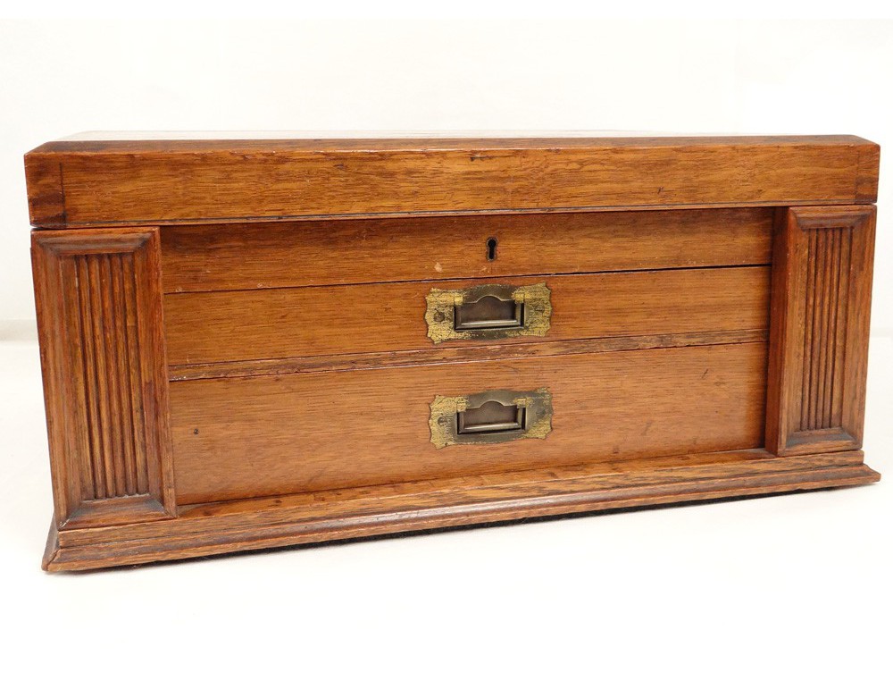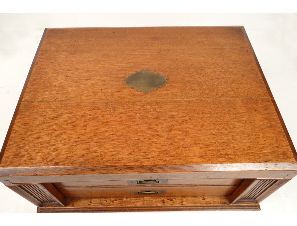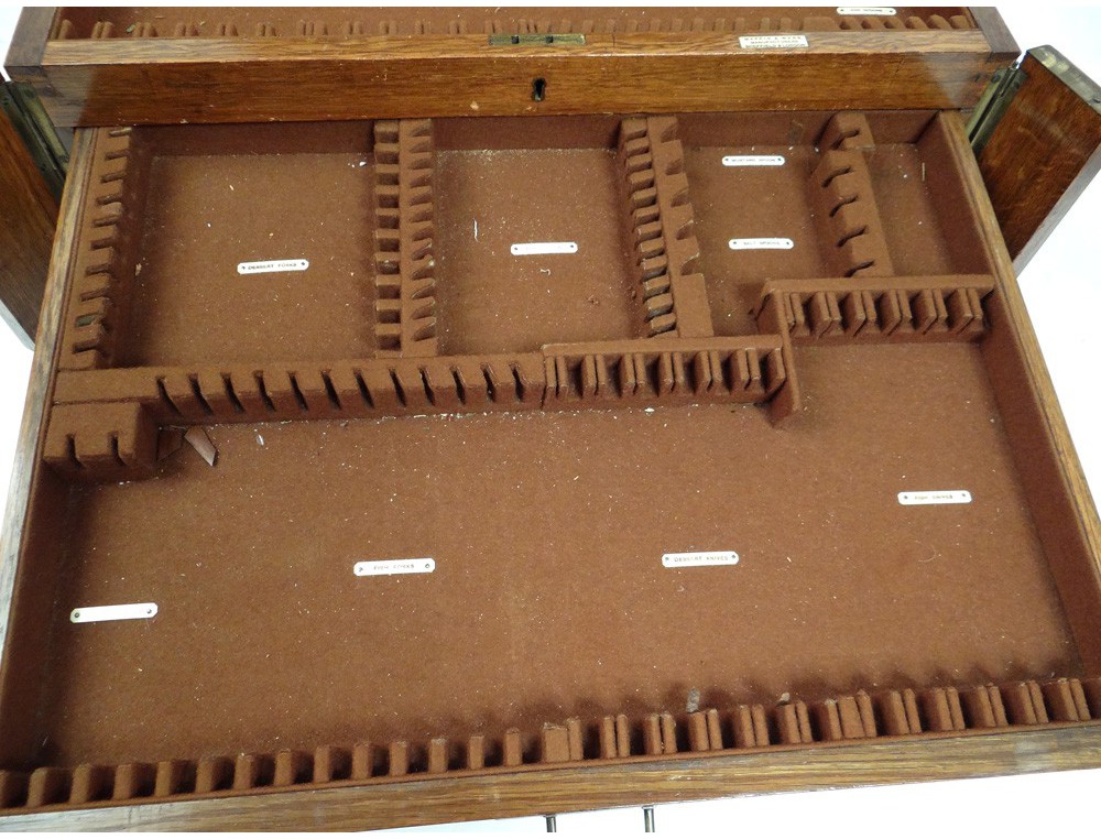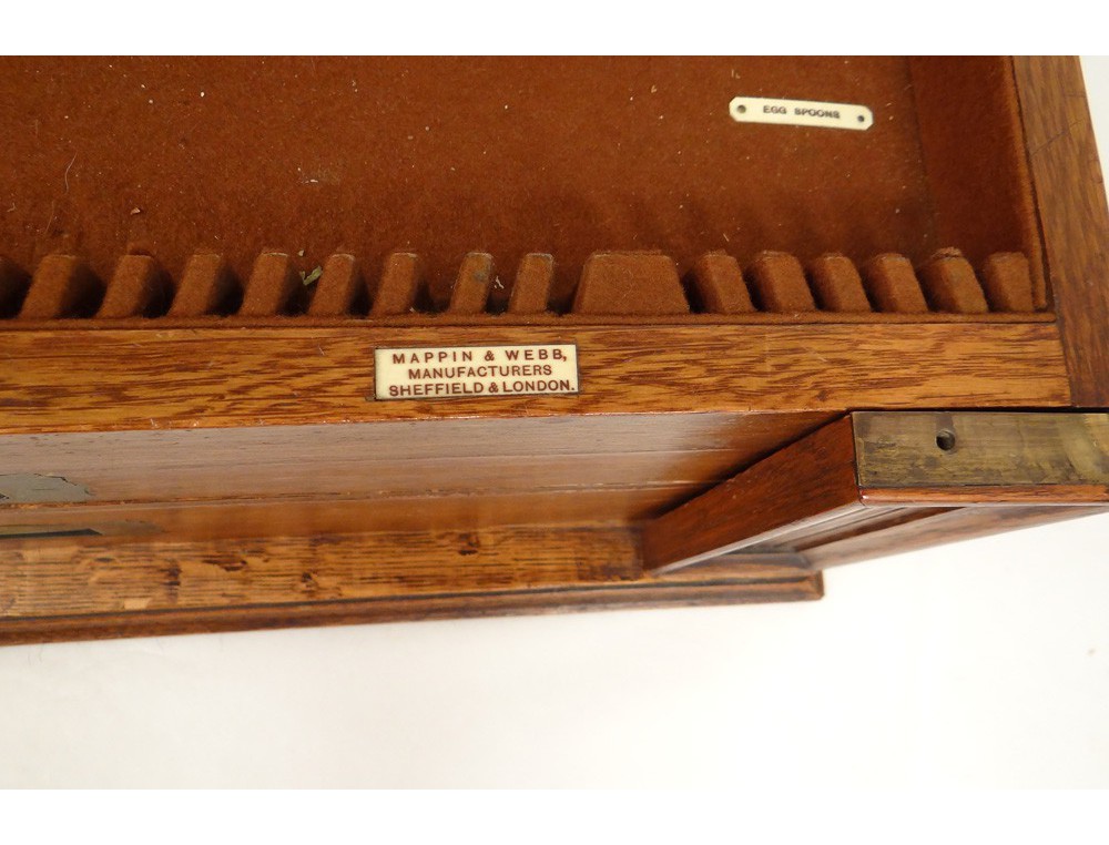 Great box for complete silverware, oak and polished brass service, two drawers on the front, signed jewelers Mappin & Webb Sheffield * Manufacturers & London, period late nineteenth and early twentieth centuries.