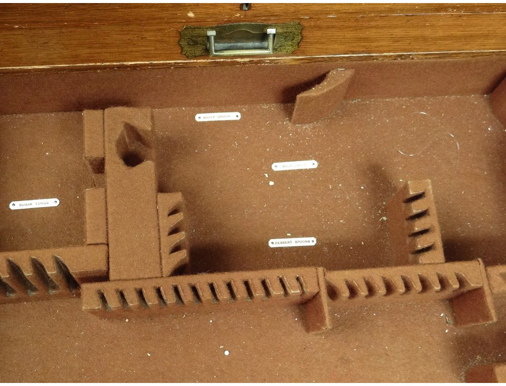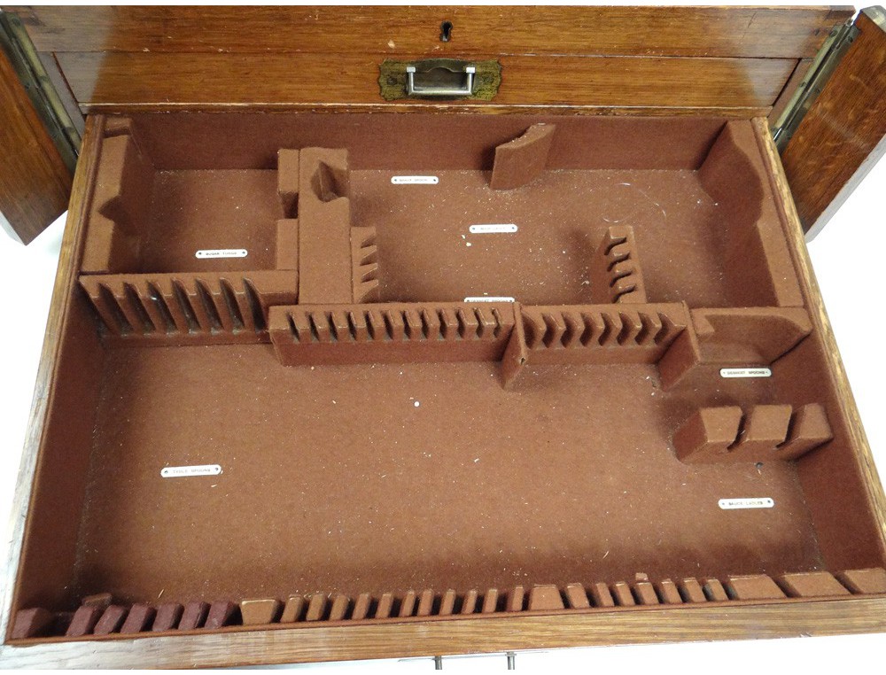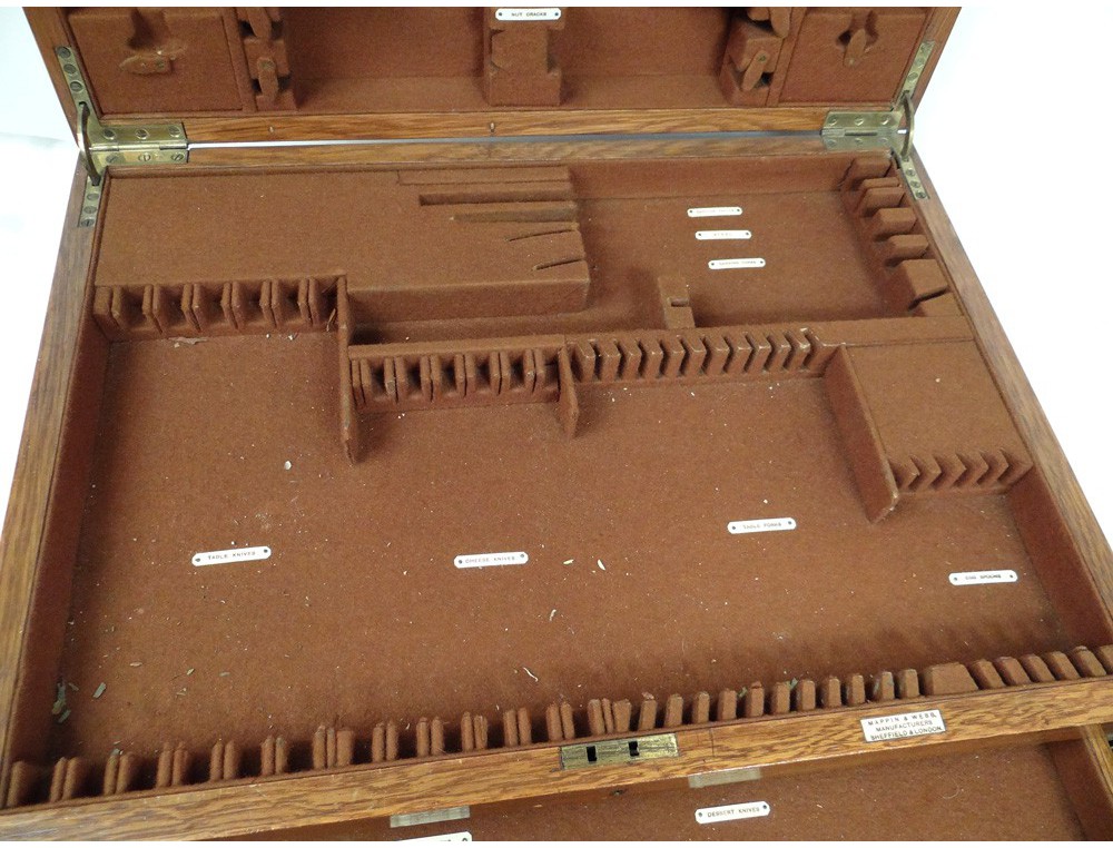 This box is in good condition. Each location is named with the name of the utensil to be there (see photos). We do not have the key.