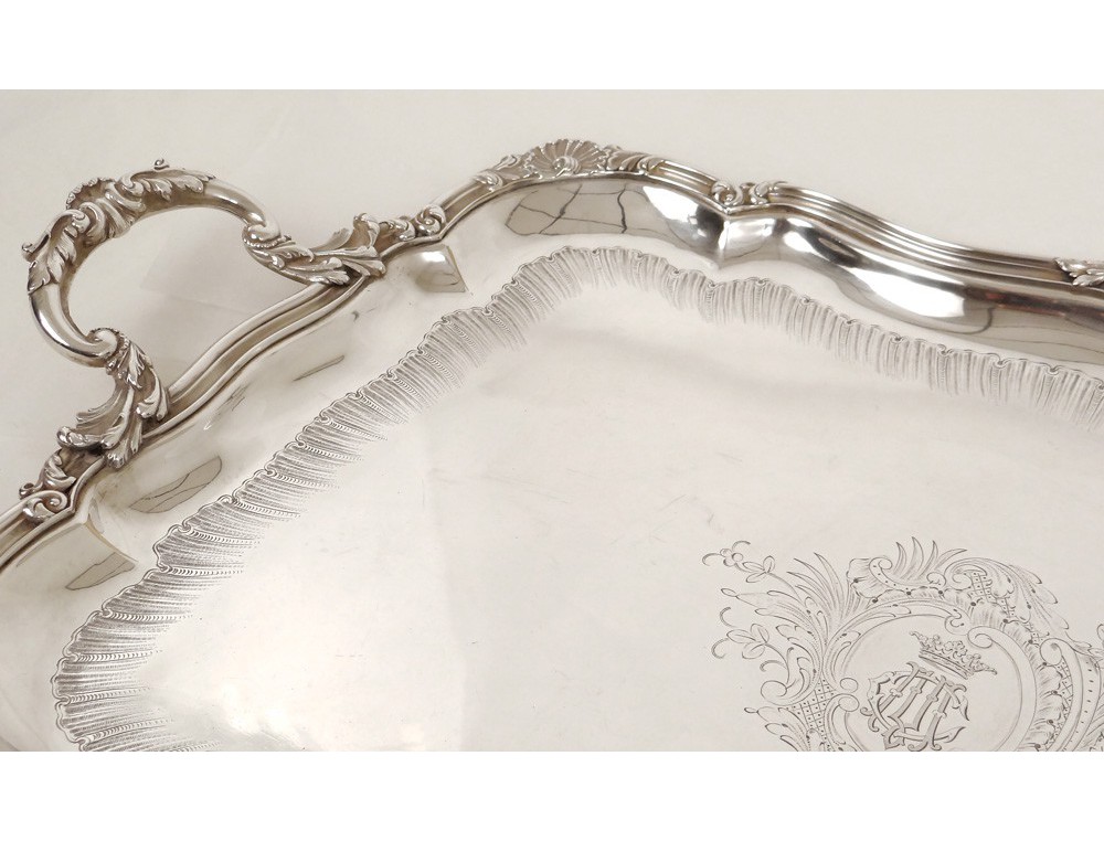 Superb large tray with handles Louis XV in silver, decorated with a coat of arms with a crowned monogram in the center, as well as shells and stylized foliage on the edge and handles, vintage twentieth century.
