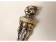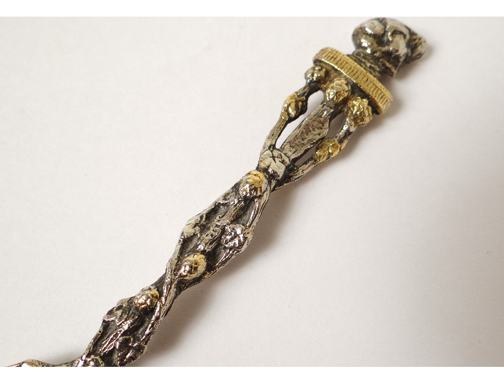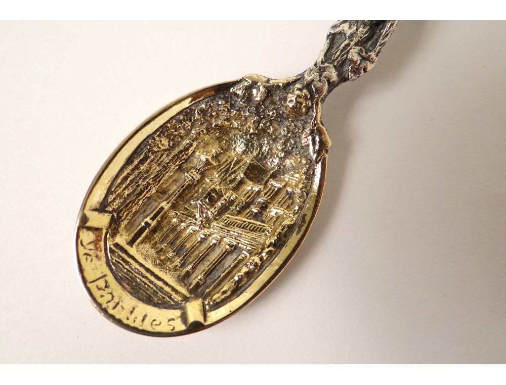 Very pretty little silver spoon and English vermeil finely chopped decorated with a view of an English village in cuilleron, sleeve-shaped plant branches, vintage late nineteenth century.