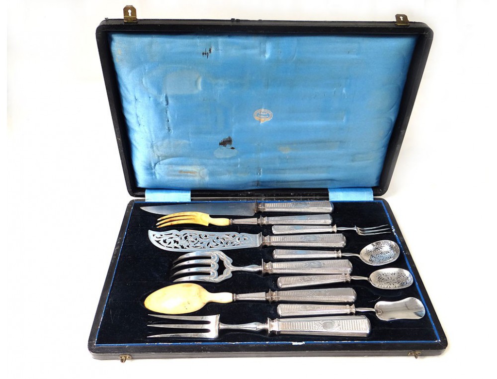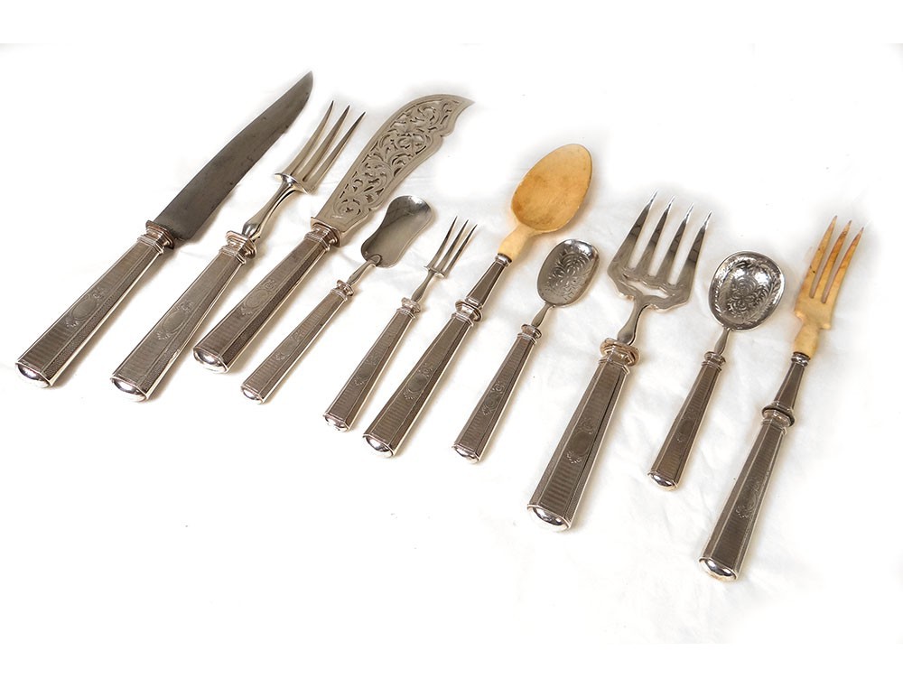 Set of cutlery set (10 pieces) consists of a thicket covered with silver salad (punch Minerva first title and goldsmith PDR) and beef bones, a sweet service 4 pieces filled and sterling silver of a thicket silver fish service and silvery metal, and a service to be cut or filled game in silver, silver metal and steel for the blade, Napoleon III nineteenth century.