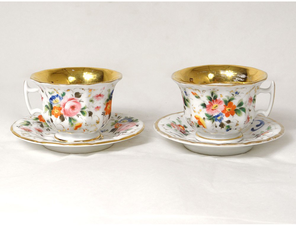 Coffee set or tea porcelain head to head to Paris, decorated with colorful flowers and gilding with tea, a jug, a sugar bowl, a milk jug and two cups in their original box inlaid rosewood and lemon nets, Napoleon III nineteenth century.