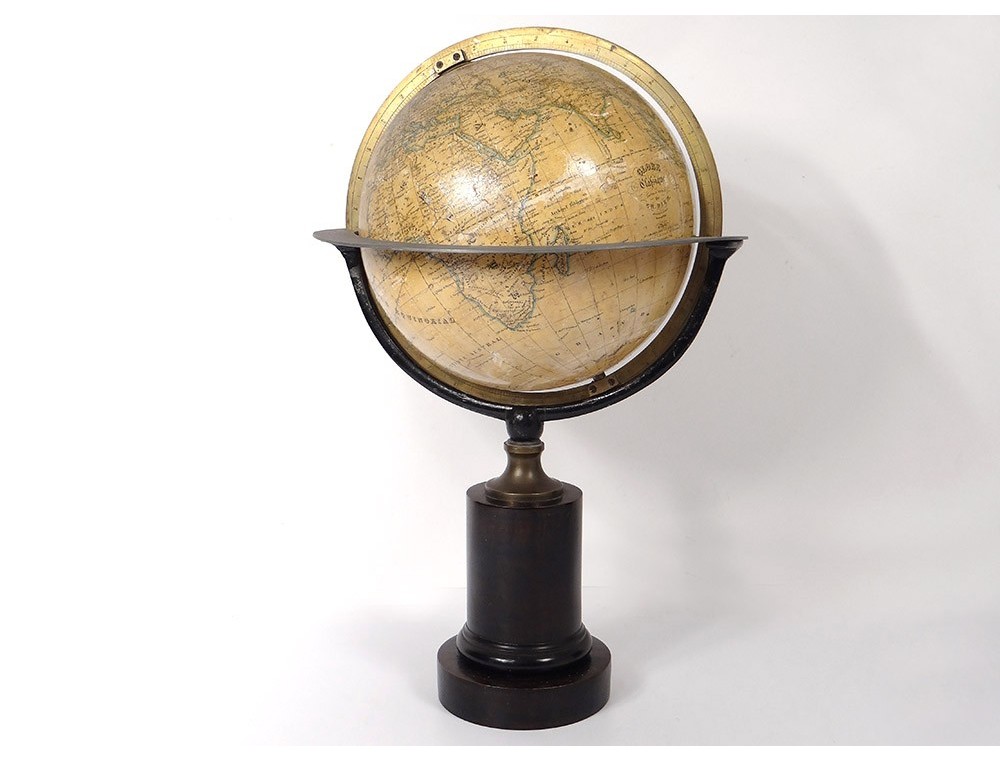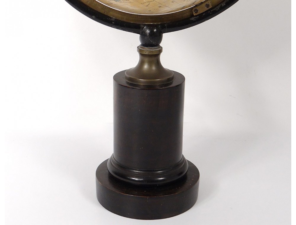 Globe or world map prepared by Charles Dien, "Globe classic New Edition By Ch. Dien Silver Medal Revue in 1845, in Paris at Ch. Dien, Rue Hautefeuille No. 13", with its meridian circle and brass equatorial table pewter or zinc, blackened wooden base, mid-nineteenth century.