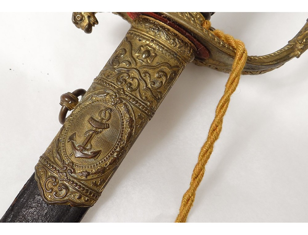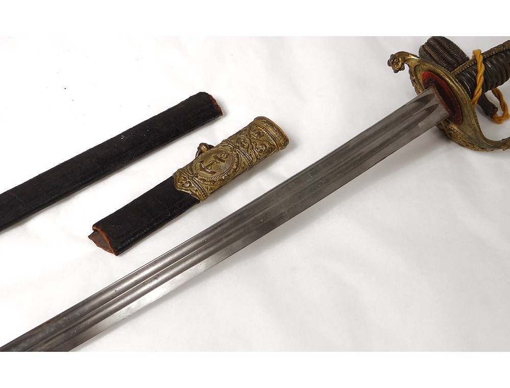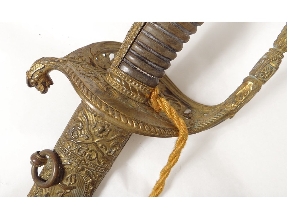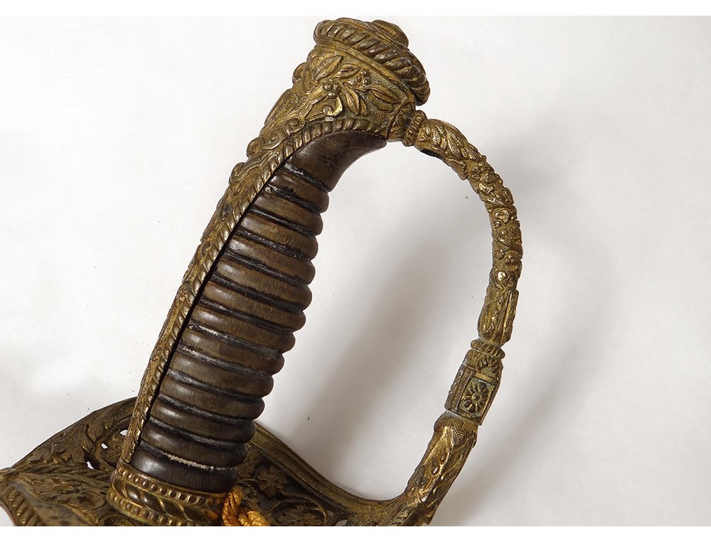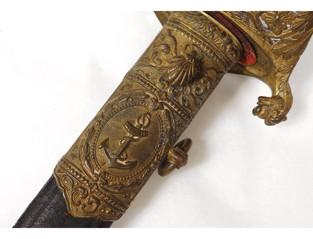 Senior Naval Officer Saber, model 1853, gilded and perforated brass guard with anchor and foliage decoration, horn handle, scabbard with two brass fittings with shell decoration, anchors and foliage scrolls, signed blade Coulaux & Cie * Klingenthal, vintage early third Republic nineteenth century.