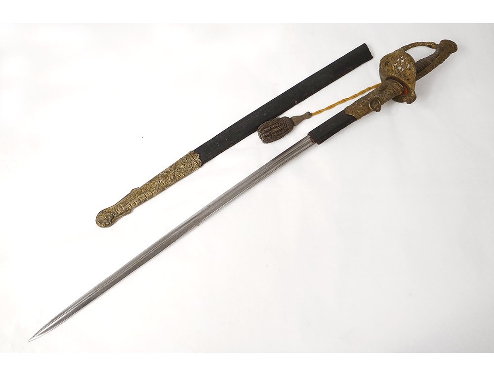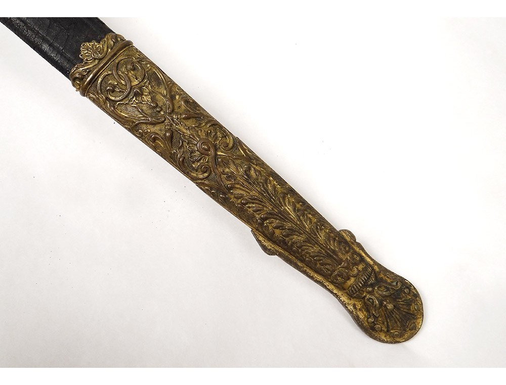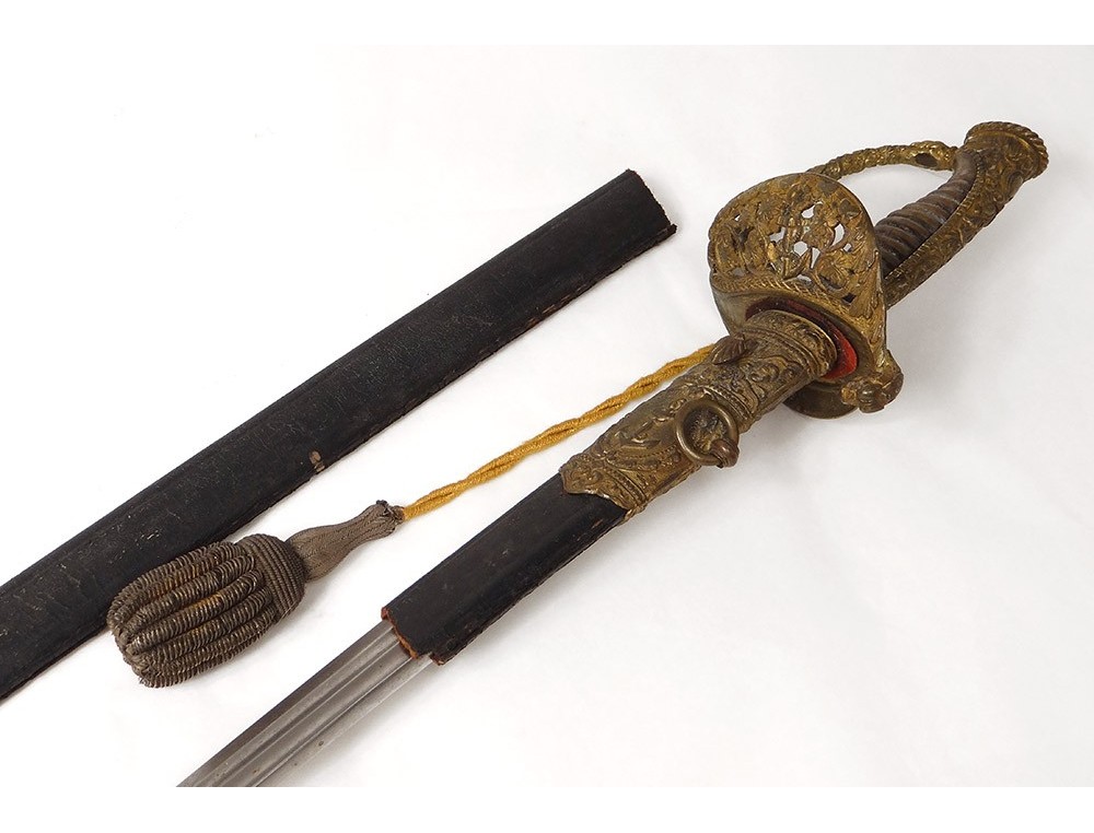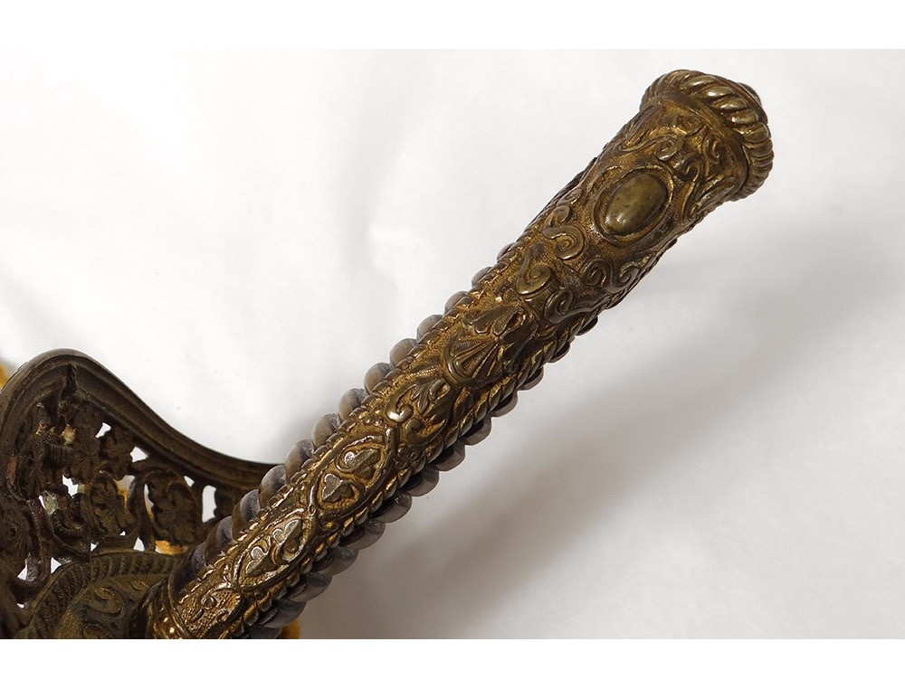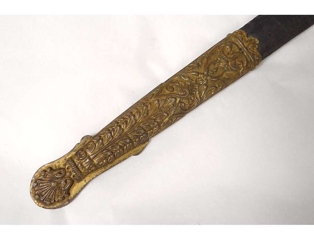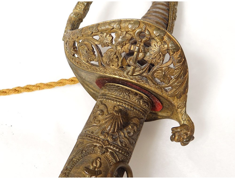 Senior Naval Officer Saber, model 1853, gilded and perforated brass guard with anchor and foliage decoration, horn handle, scabbard with two brass fittings with shell decoration, anchors and foliage scrolls, signed blade Coulaux & Cie * Klingenthal, vintage early third Republic nineteenth century.