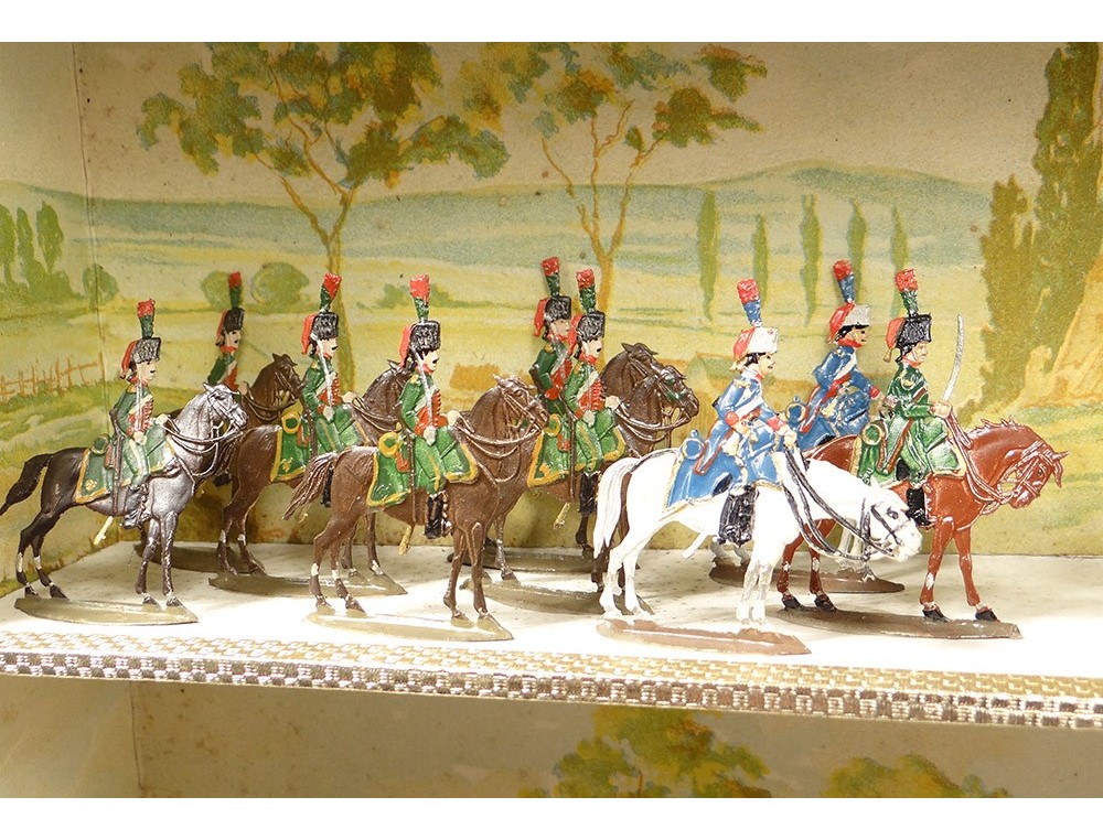 Diorama set with 52 elements and polychrome lead soldiers, of the CBG * Paris brand, Empire Magazine No. 8, representing the Emperor Napoleon's Imperial Guard on a field camp (with a battalion of Italian grenadiers, cavalry, officers and camp management staff), vintage twentieth century.