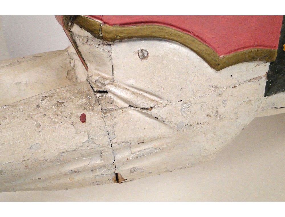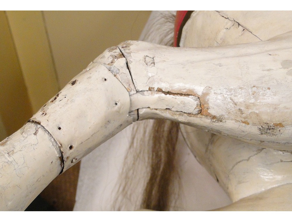 A report: posterior restorations of use (including a metal plate on a hind leg), some cracks on the wood and polychrome shortages, although looking at the pictures.