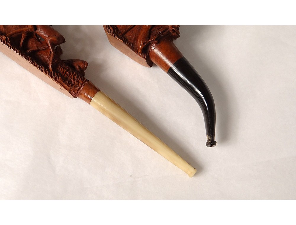 Set of two old pipes finely carved heather decor deer and stag, horn pipes, work in the style of the pipe Monn (Raymond Monneret) in St. Claude, vintage twentieth century.
