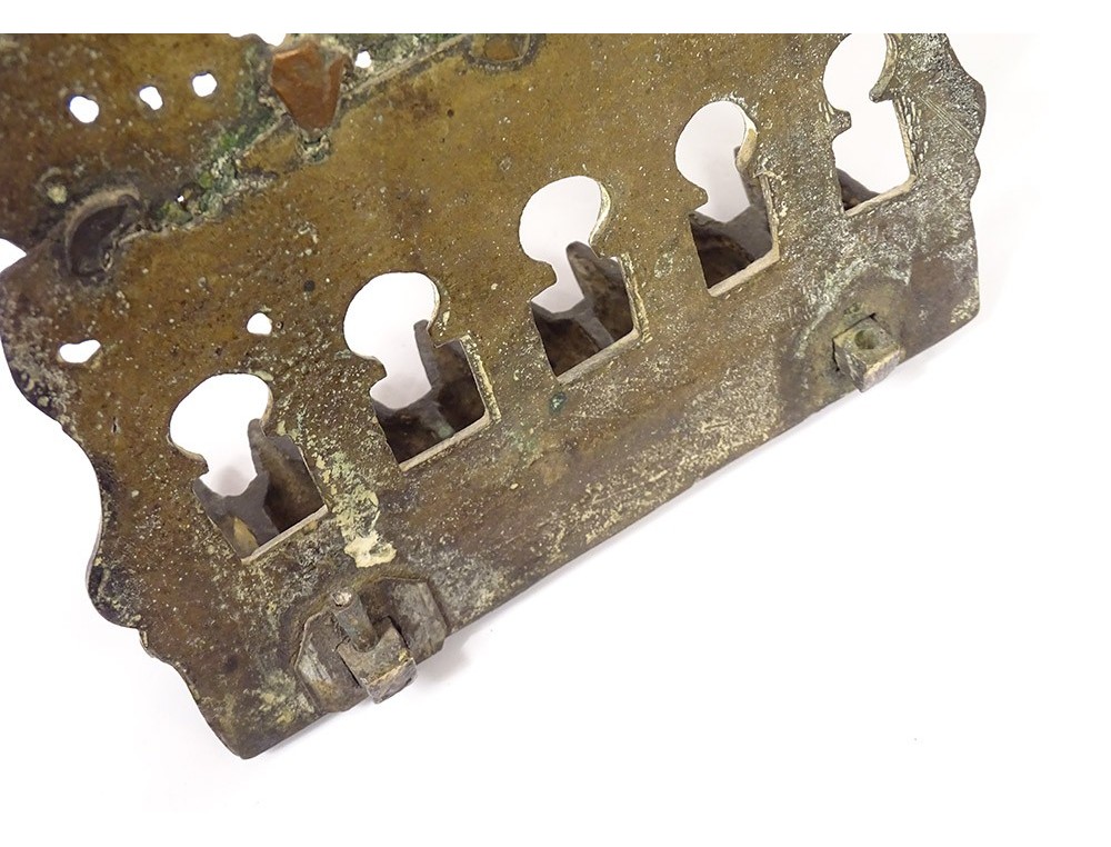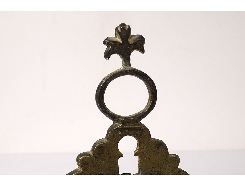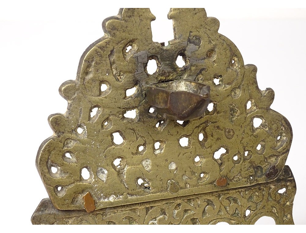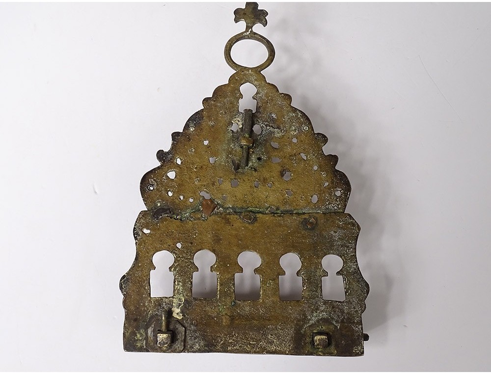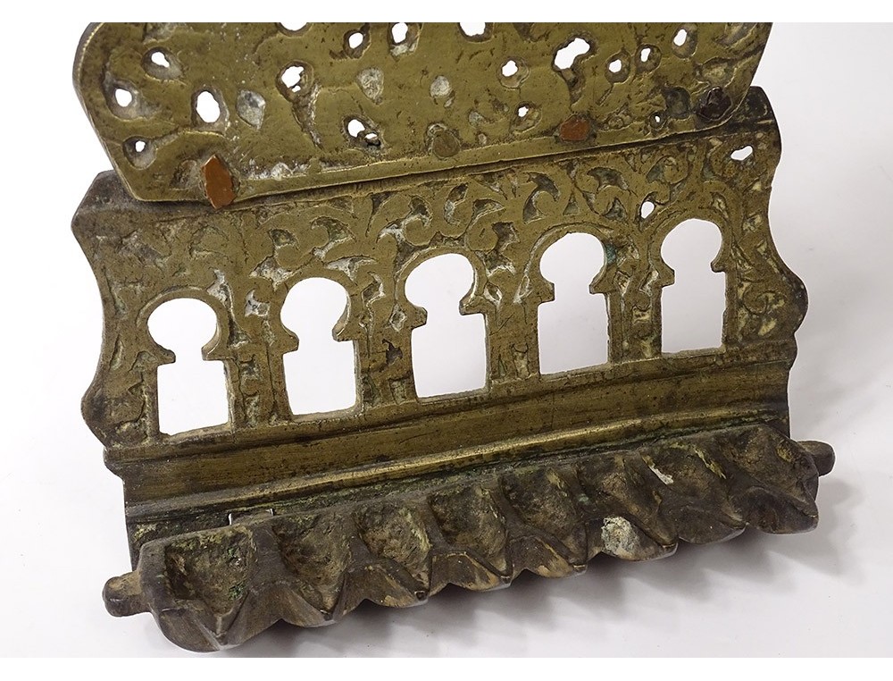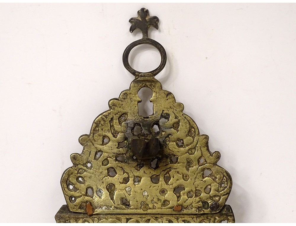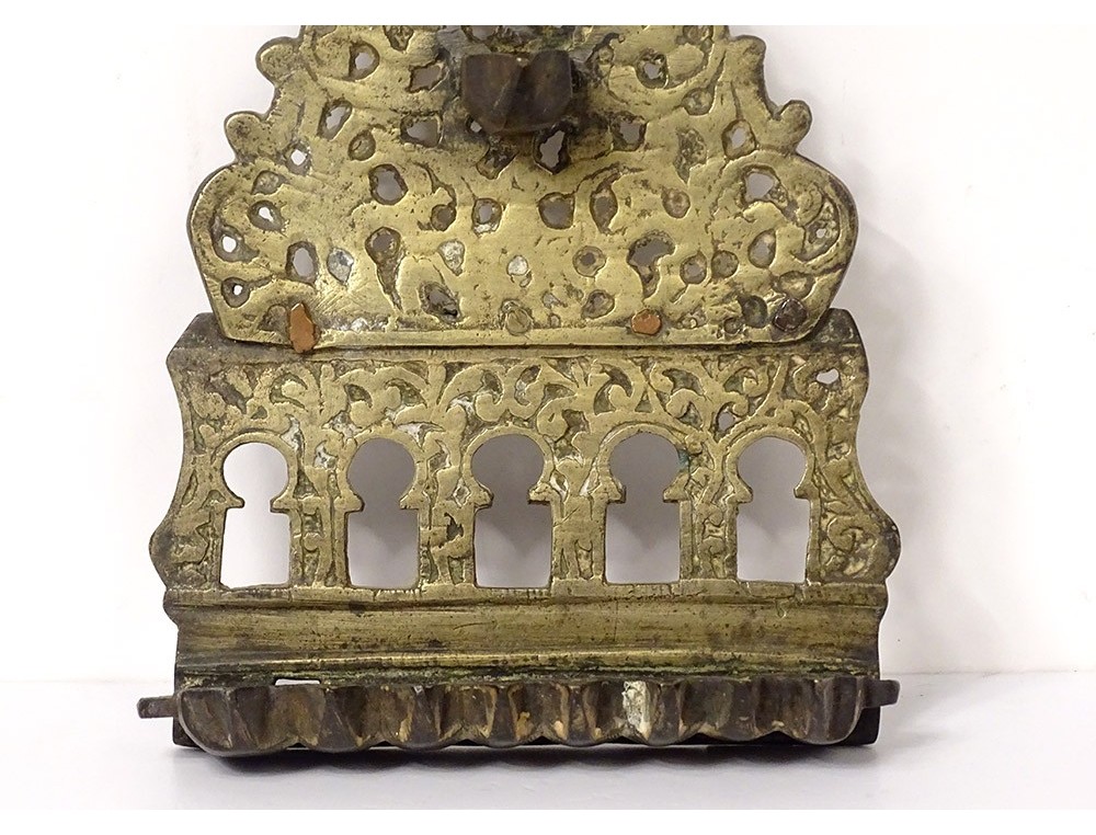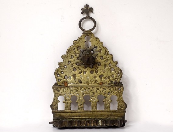 Small Jewish lamp called Hanukkah in chased and openwork bronze with architectural decoration of arches and plant motif, used during the Hanukkah festival *, from the 18th century.
