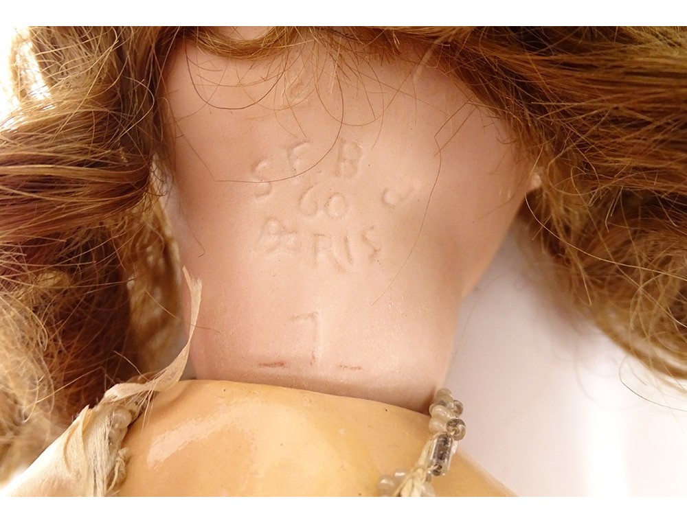 SFBJ 60 Paris old doll, size 7, porcelain biscuit head, sleepy blue eyes, ajar mouth and visible teeth, composite body, articulated arms and legs, with their original clothes and shoes, from the 20th century century.