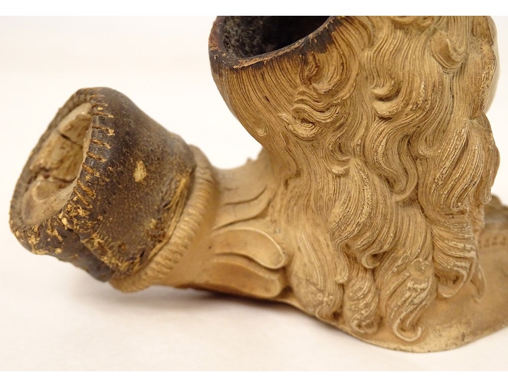 A note: the top of the pipe has been broken, restored and reinforced with leather, tiny chips, some dirt and wear of time, see photos.
