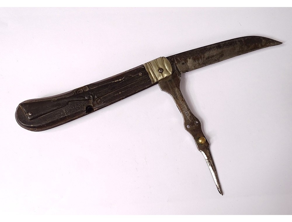 Antique hunter's knife, carved horn handle decorated with hunting rifles, steel blades (Cartouche brand), vintage late 19th century.