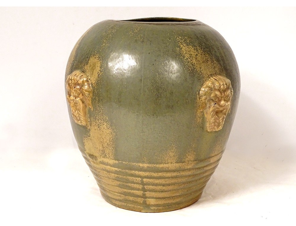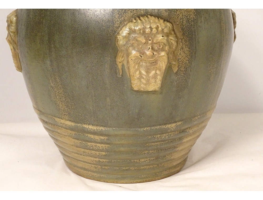 Large polychrome sandstone vase (green-beige), decorated with bas-relief pastilles representing masks of fauns or satyrs, signed Primavera ** and Louis Lourioux * below, from the twentieth century.
