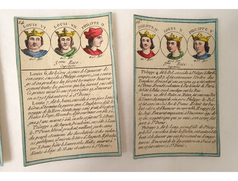 Set of 14 cards retracing the chronological history of the Kings of France, from the 19th century.