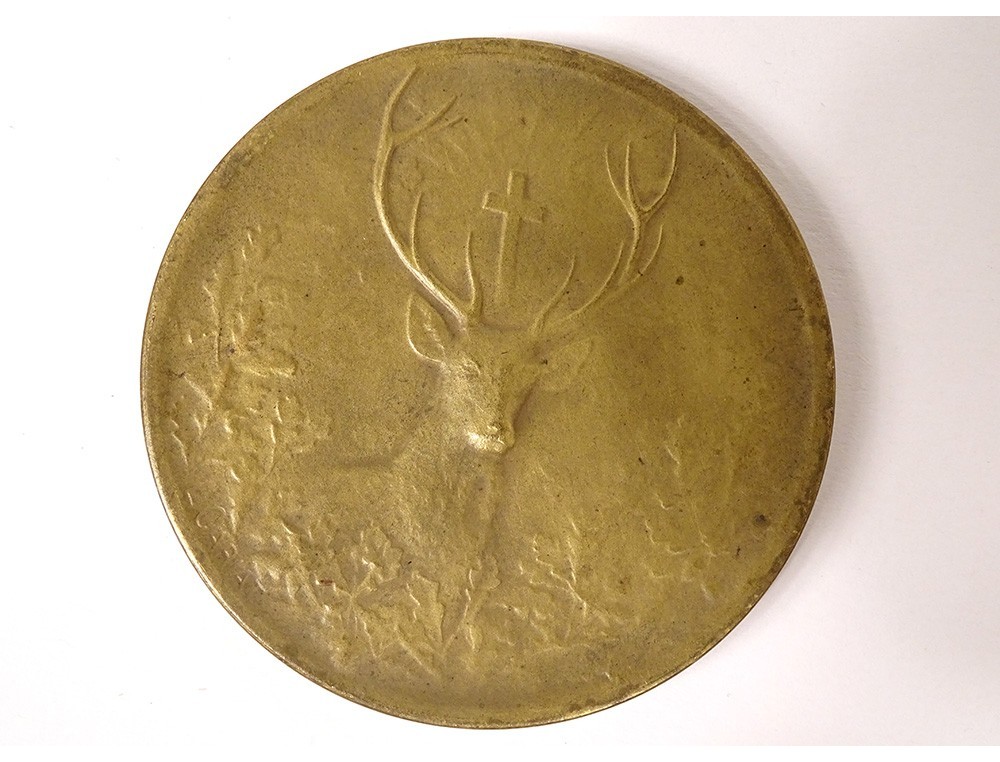 Bronze medal representing on the obverse the Deer of Saint-Hubert (engraver Cariat); on the reverse a hunting horn with oak branch and the inscription Société Canine Bretonne (L. Cariat), vintage circa 1930 twentieth century.