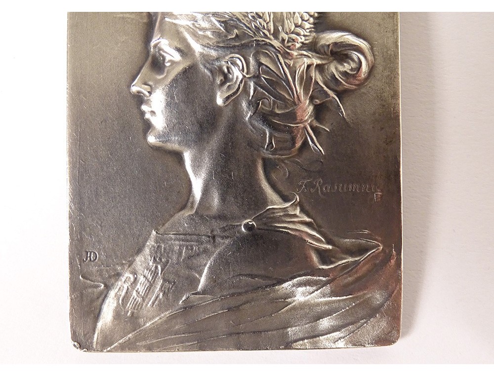 Rectangular medal in solid silver (950) representing the profile of Marianne on the obverse, signature F. Rasumny; on the reverse side inscription French Republic - Agricultural Association of St-Amand (Cher) - Competition of Chatelet-en-Berry 1906, vintage early twentieth century.